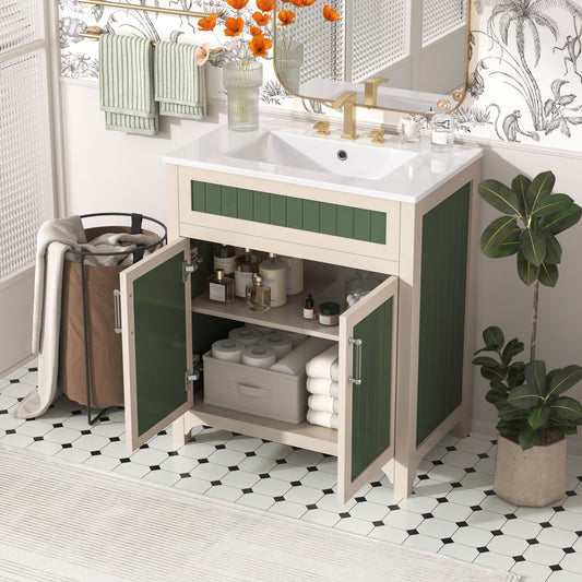 Bathroom Vanity Cabinet With Ceramic Sink Combo Set, Frame Modern Bathroom Storage Cabinet With Height Adjustable Shelf - Beige / Green