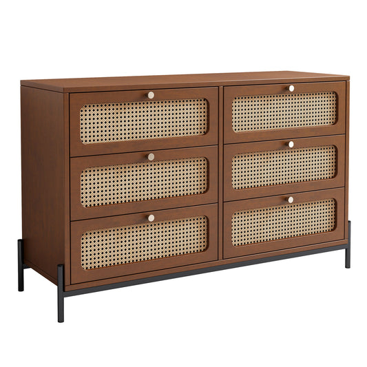 Modern Cannage Rattan Wood Closet 6 Drawer Dresser Wood Storage Cabinet Sideboard For Bedroom, Living Room, Entryway, Hallway