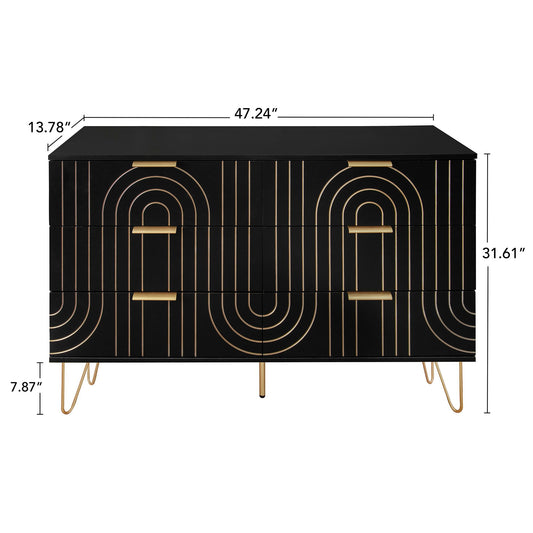 Modern 6 Drawer Dresser, Modern Dresser With Metal Handles, Storage Chest Of Drawer, Wide Dresser Drawer Organizers With Carving Design For Bedroom, Living Room, Hallway - Black