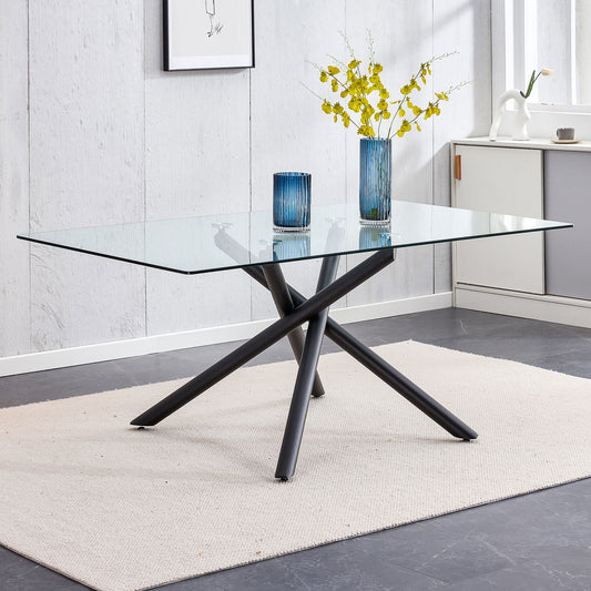 Minimalist Rectangular Glass Dining Table For 6 - 8 With Tempered Glass Top And Metal Legs - Black / Transparent