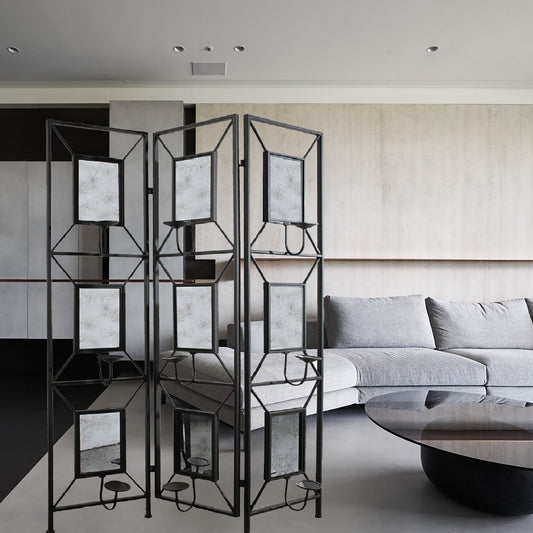 Room Photo Frames Screen Divider Screens, 3 Panel Decorative Screen With Photo Frames, Antique Mirror, Candle Stick - Black