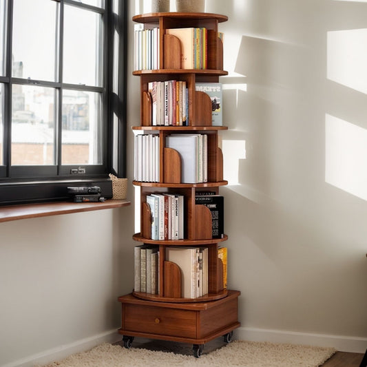 6 Tier Rotating Bookshelf With Wheels, 360° Wood Corner Bookcase Organizer For Small Spaces - Walnut Brown