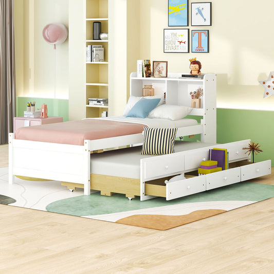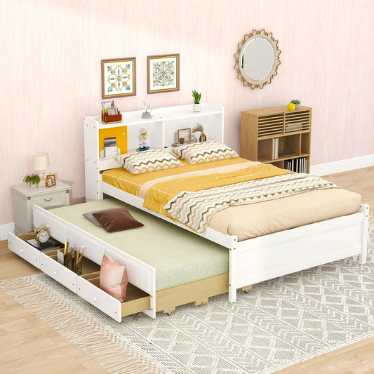 Bed With USB & Type-C Ports, LED Light, Bookcase Headboard, Trundle And 3 Storage Drawers, Bed With Bookcase Headboard, Trundle And Storage Drawers
