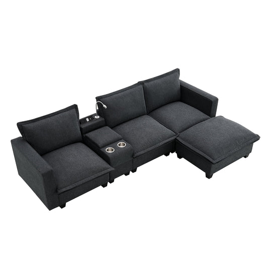 Modern Sectional Cloud Sofa With Console USB Charger Reading Light Cup Holder, Wide Seat 4 Seat Modular Couch Storable Indoor Funiture
