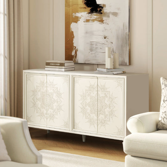 Mahal - Hand Painted Mandala Lacquered Sideboard - Ivory Off-White