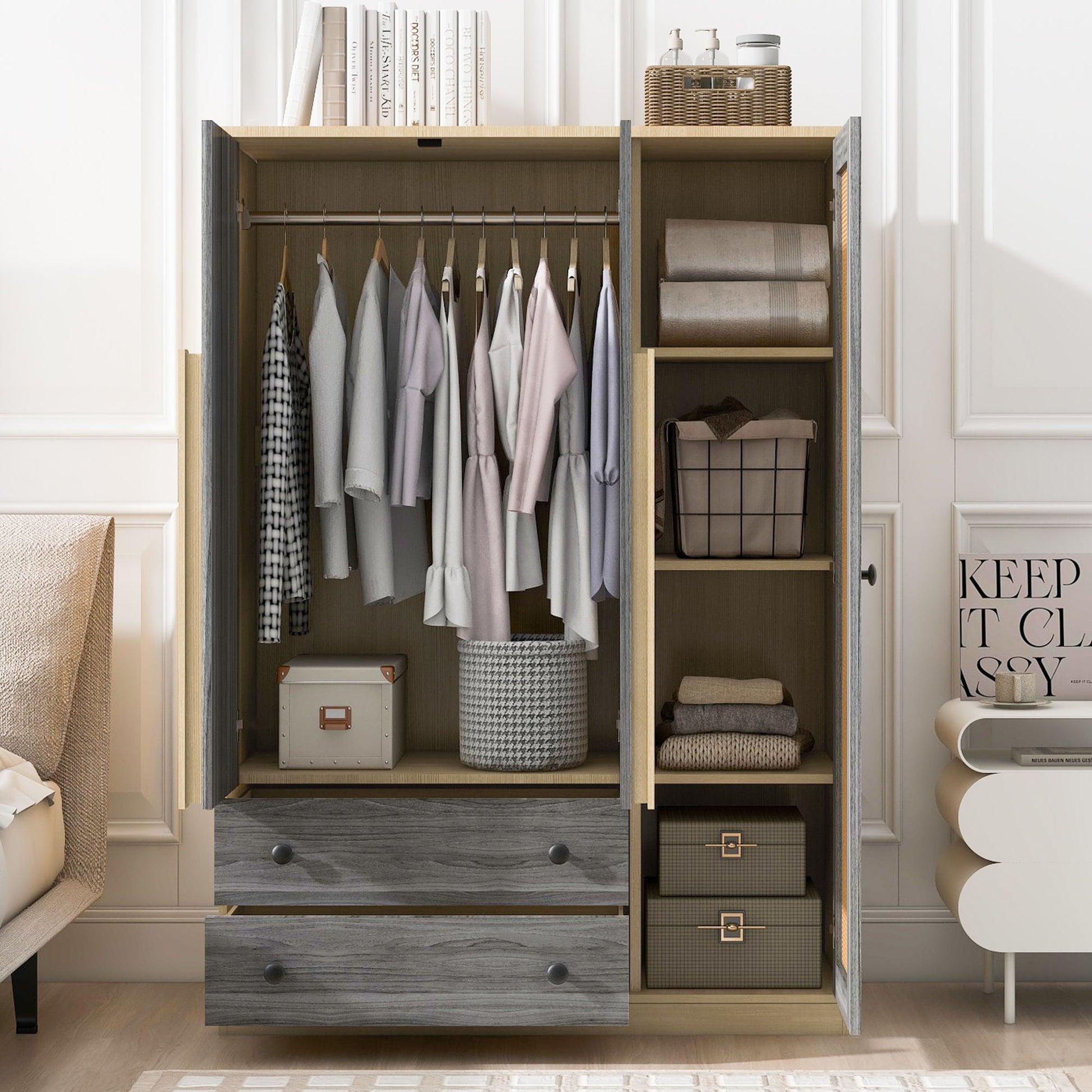 3 Doors Rattan Wardrobe Storage For Bedroom, With 2 Drawers - Gray / Nature
