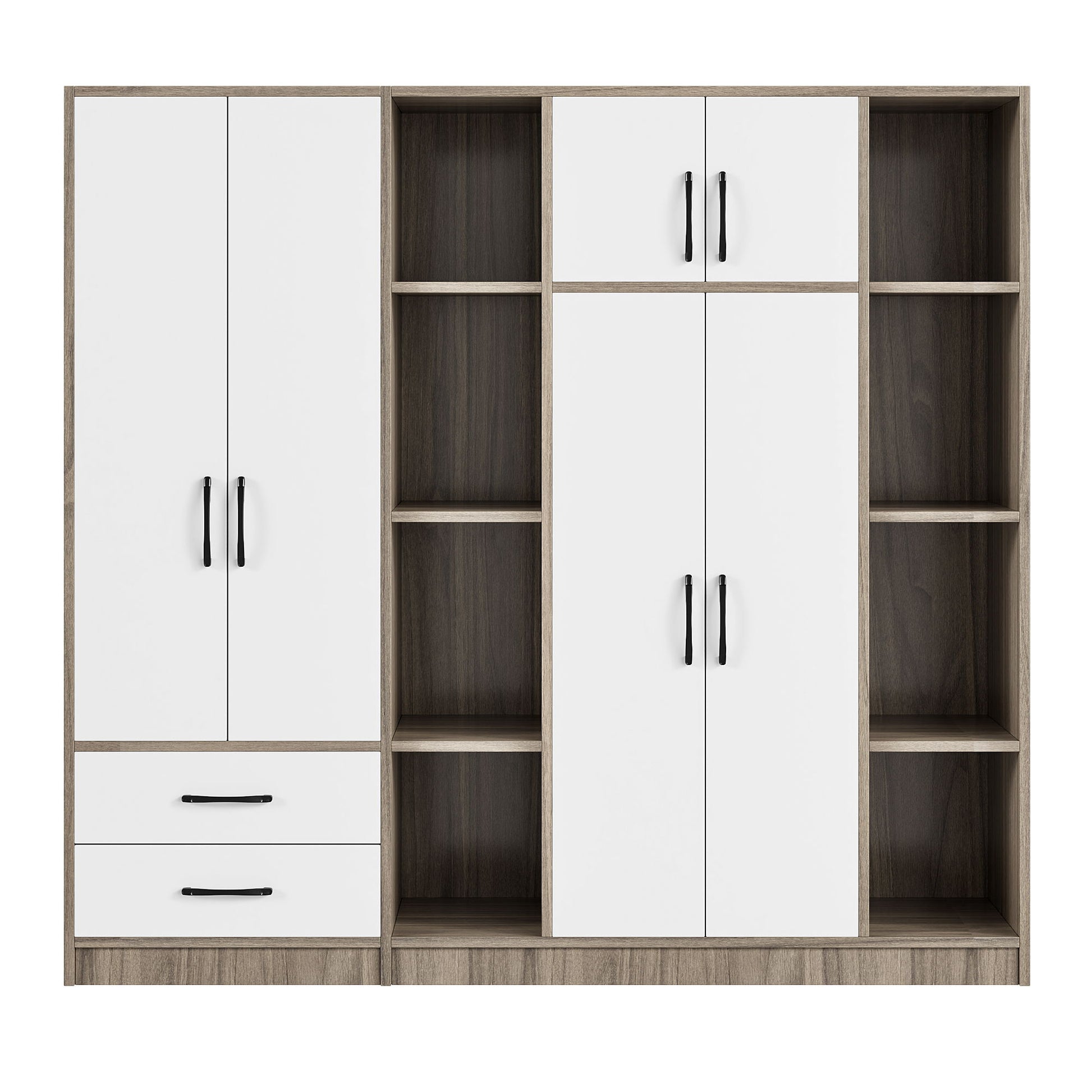 Maximized Storage: 6-Door Design Offers versatile storage options, including two dust-proof sections with hanging rods, pull-out drawers, a closed cabinet, and eight open shelves, providing ample room for a variety of items, from clothing to personal belongings.