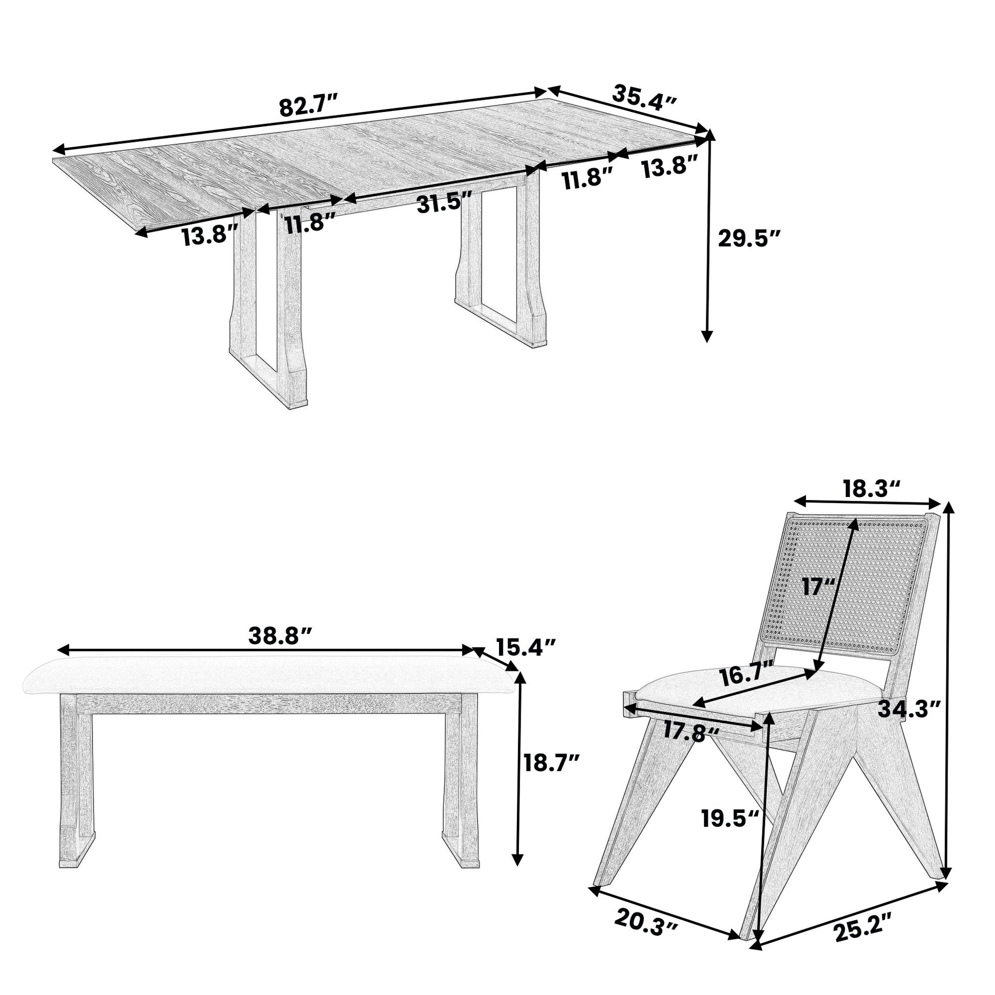 - Dimensions and Shipping: The table dimensions are 59.1-82.7" x 35.4" x 29.5", chairs are 20.3" x 25.2" x 34.3", and the bench is 38.8" x 15.4" x 18.7". The set comes in two boxes, which may not arrive together.