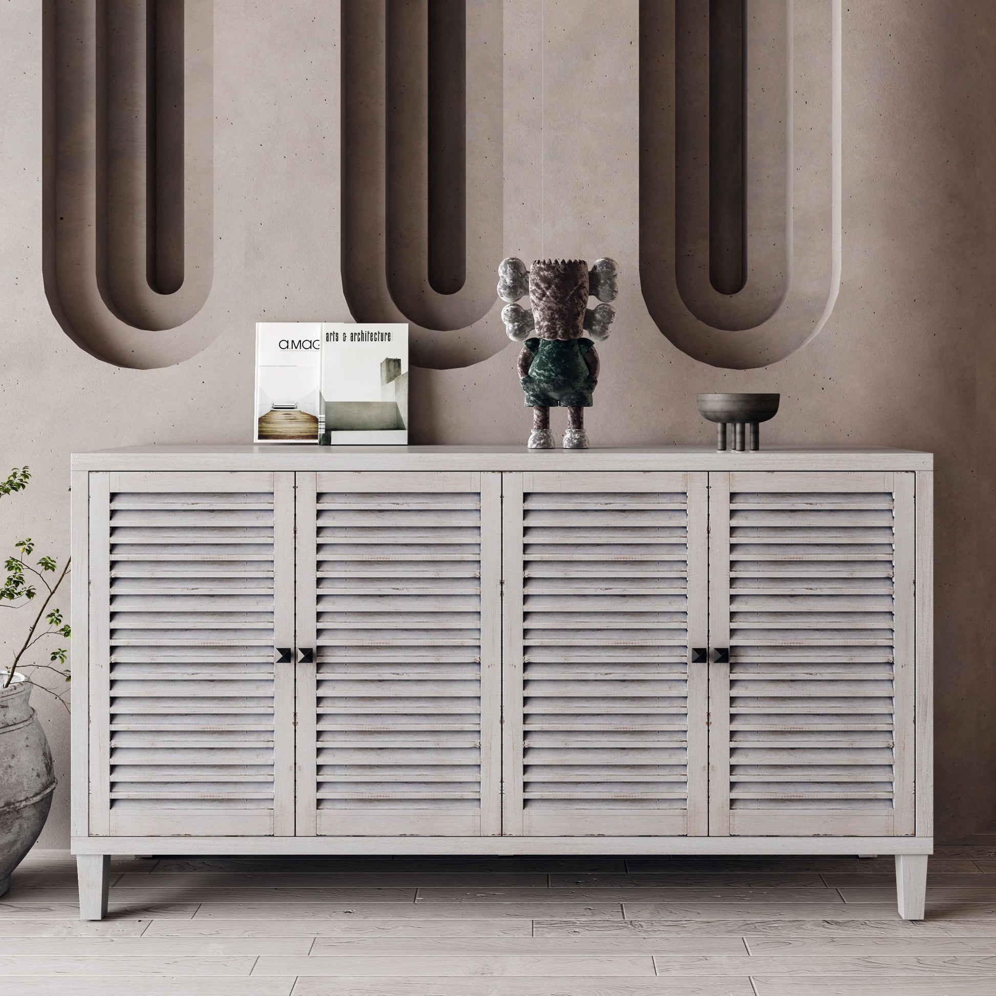 Accent Cabinet 4 Shutter Door Wooden Cabinet Sideboard Buffet Server Cabinet Storage Cabinet, For Living Room, Entryway, Hallway, Office, Kitchen And Dining Room - Distressed White