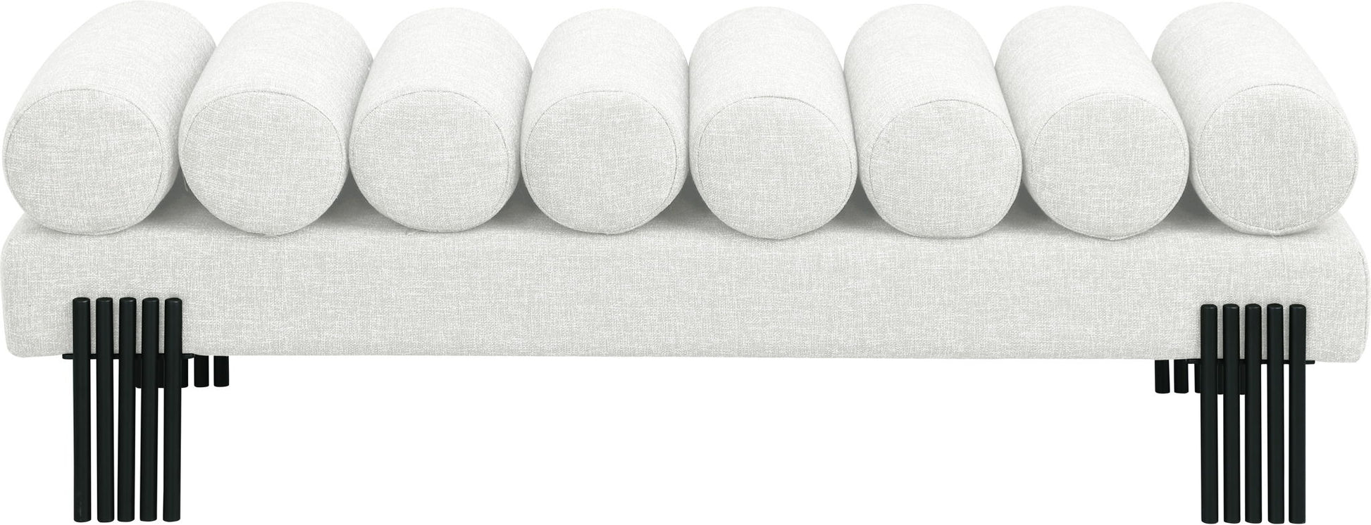 Revitalize your seating area with this stunning Akeela linen textured fabric bench featuring a rolled cushion top. Upholstered in rich linen textured fabric, this bench delivers both comfort and sophistication and features matte black metal legs to provide sturdy support while adding a modern touch to its art deco design. An ideal addition to an entryway, bedroom, or living room, the bench redefines your space with timeless charm.