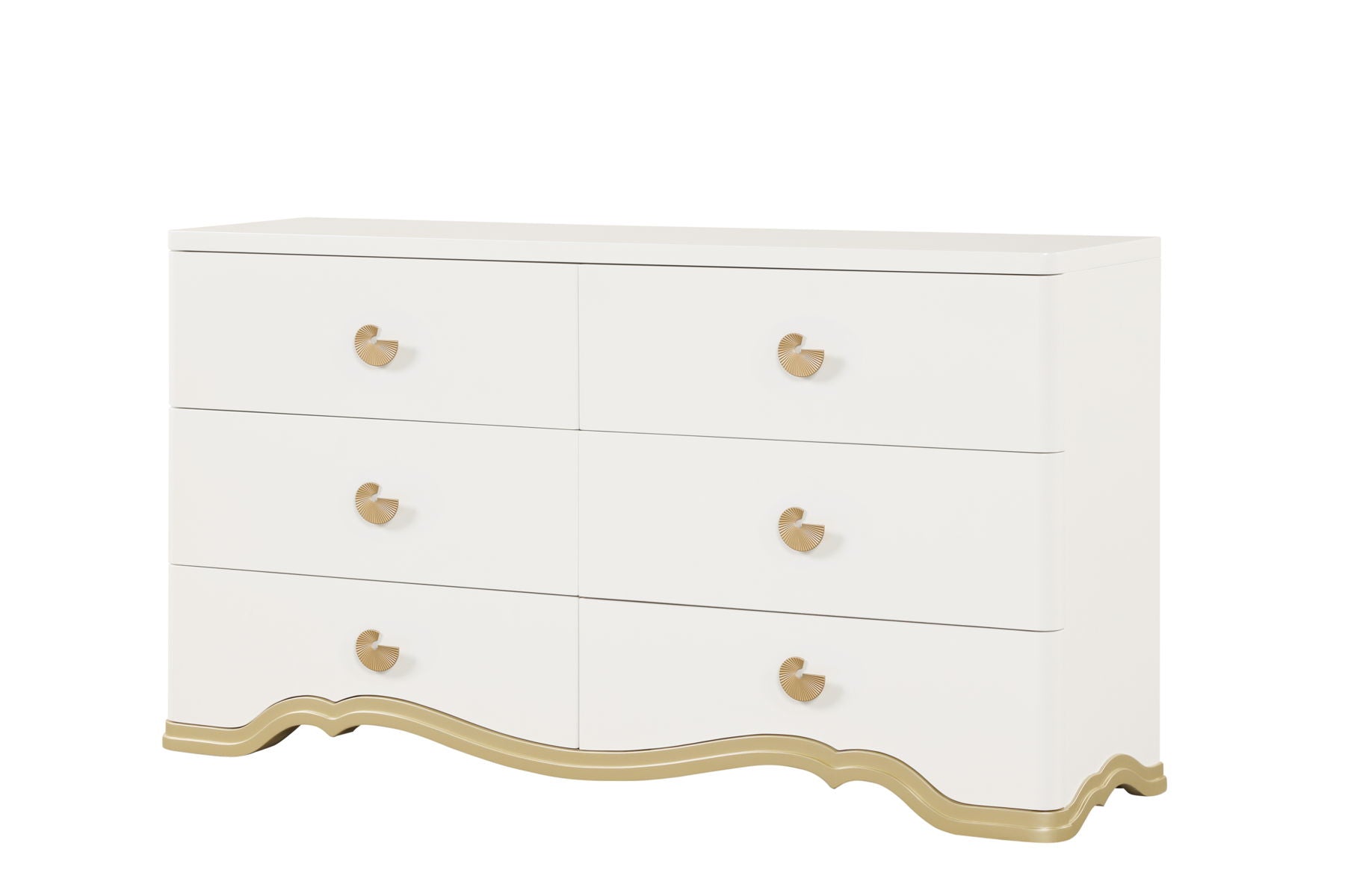 The Athena Dresser in a pristine finish is a vision of timeless elegance and refined luxury. Adorned with exquisite gold trim along its bottom edges, this dresser stands as a testament to meticulous craftsmanship and opulent design. The sea shell-like gold handle pulls add a touch of whimsical charm, elevating the dresser to a level of unmatched sophistication. The elegant finish, paired with the lustrous gold accents, creates a refreshing and airy ambiance that effortlessly brightens your space. The Athena Dresser, with its perfect fusion of purity and opulence, becomes a striking centerpiece in your bedroom – a testament to the seamless integration of functionality and high-end aesthetics.