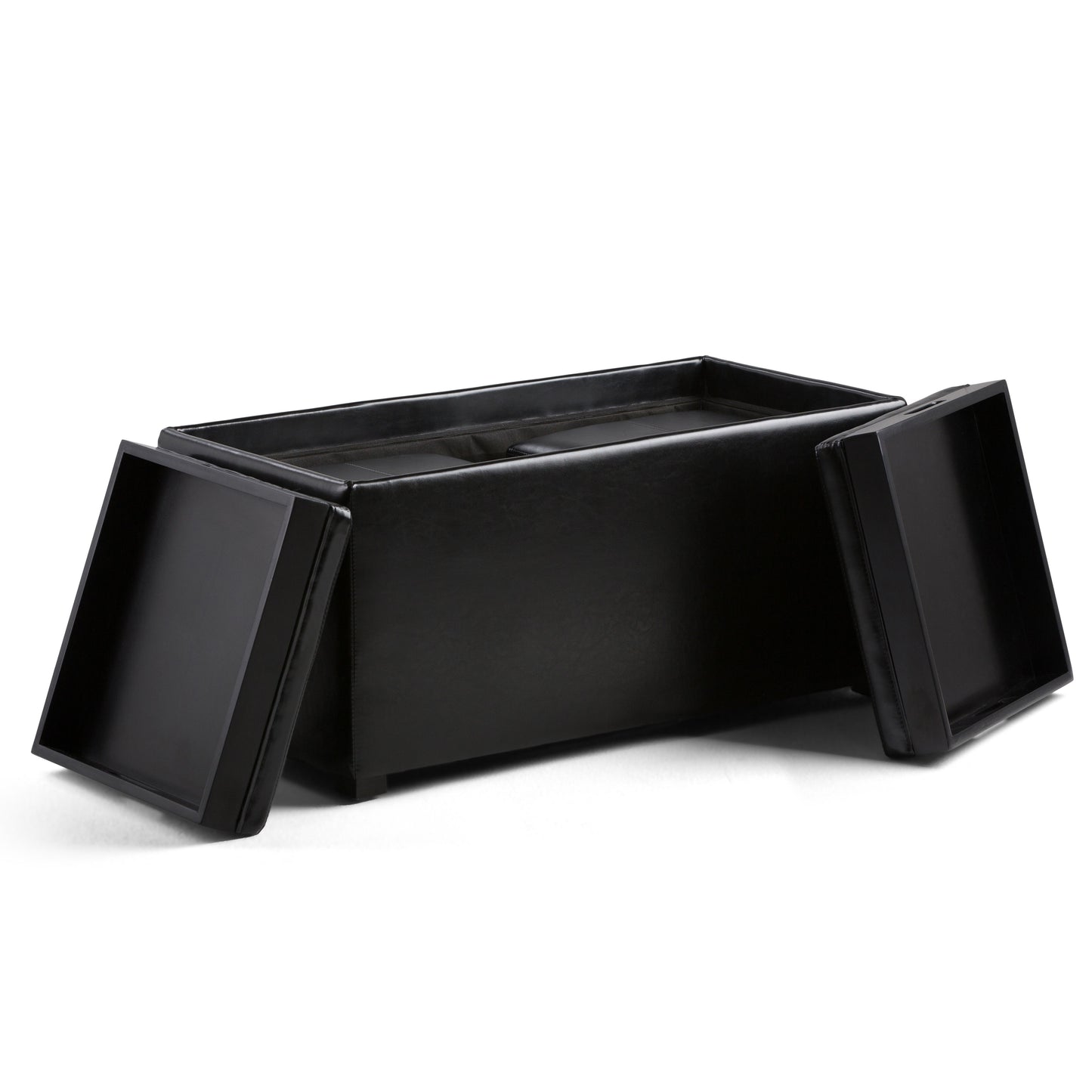 - Features a 5 piece ottoman set with 1 large rectangular ottoman and 2 smaller ottomans, large interior storage space, two flip over serving trays