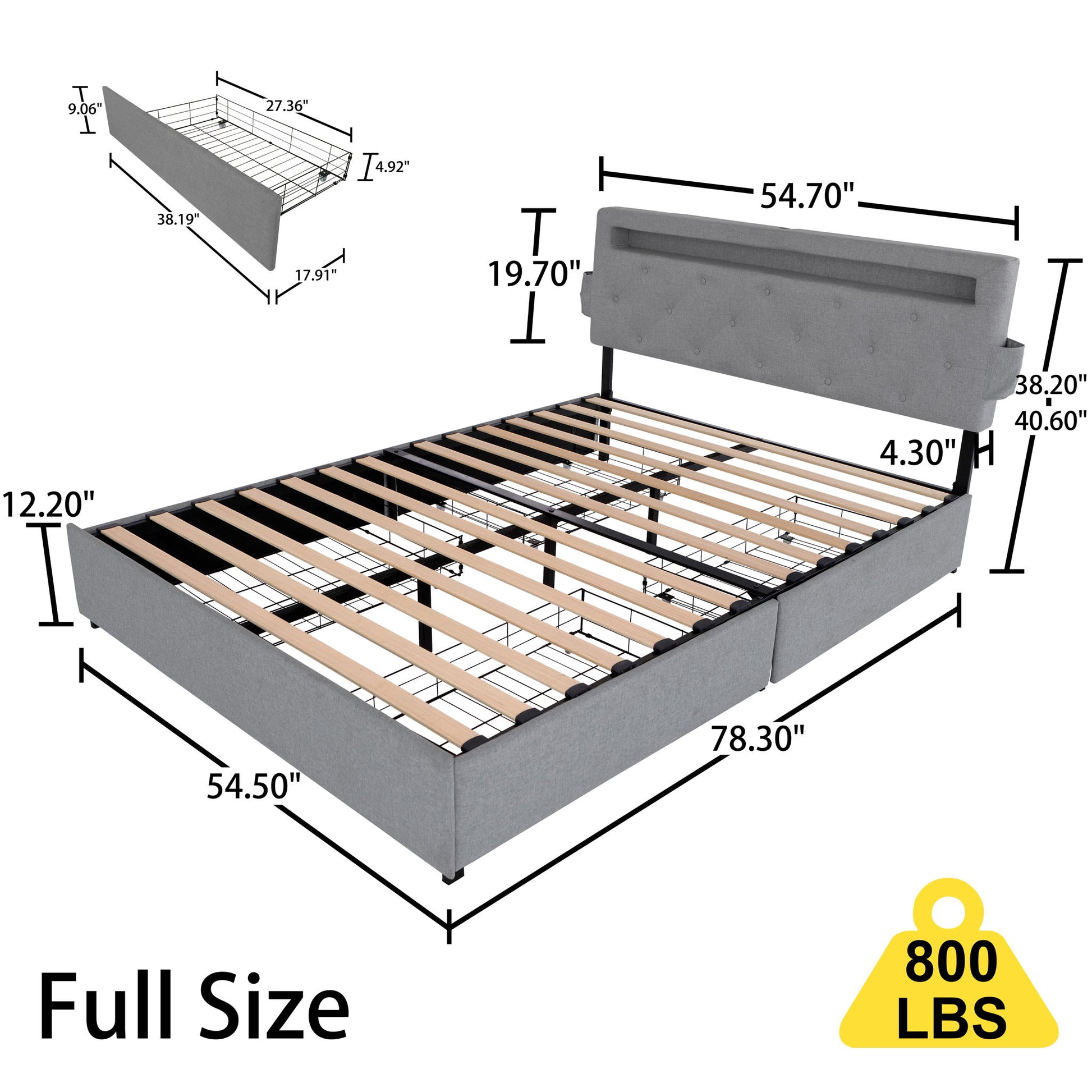 Full Bed Frame With USB Charging Station, LED Lights, Headboard & 4 Storage Drawers Upholstered Design - Light Gray