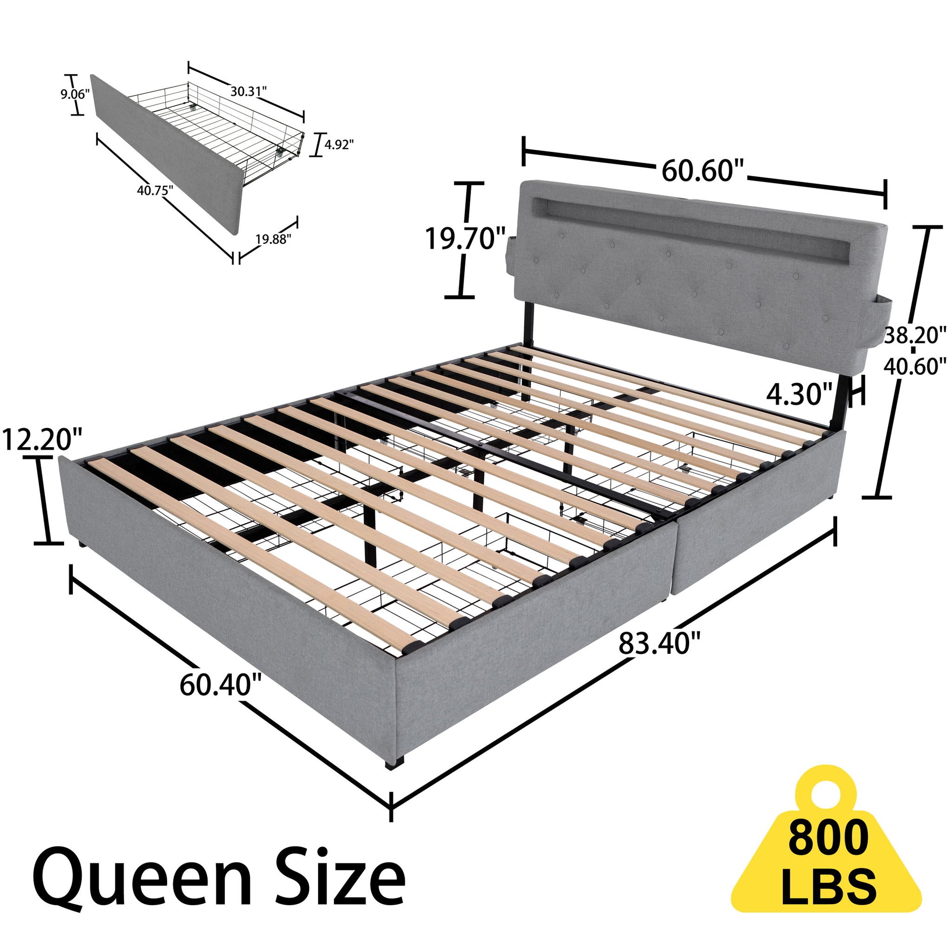 Queen Bed Frame With USB Charging, LED Lights & Storage Drawers Upholstered - Dark Gray