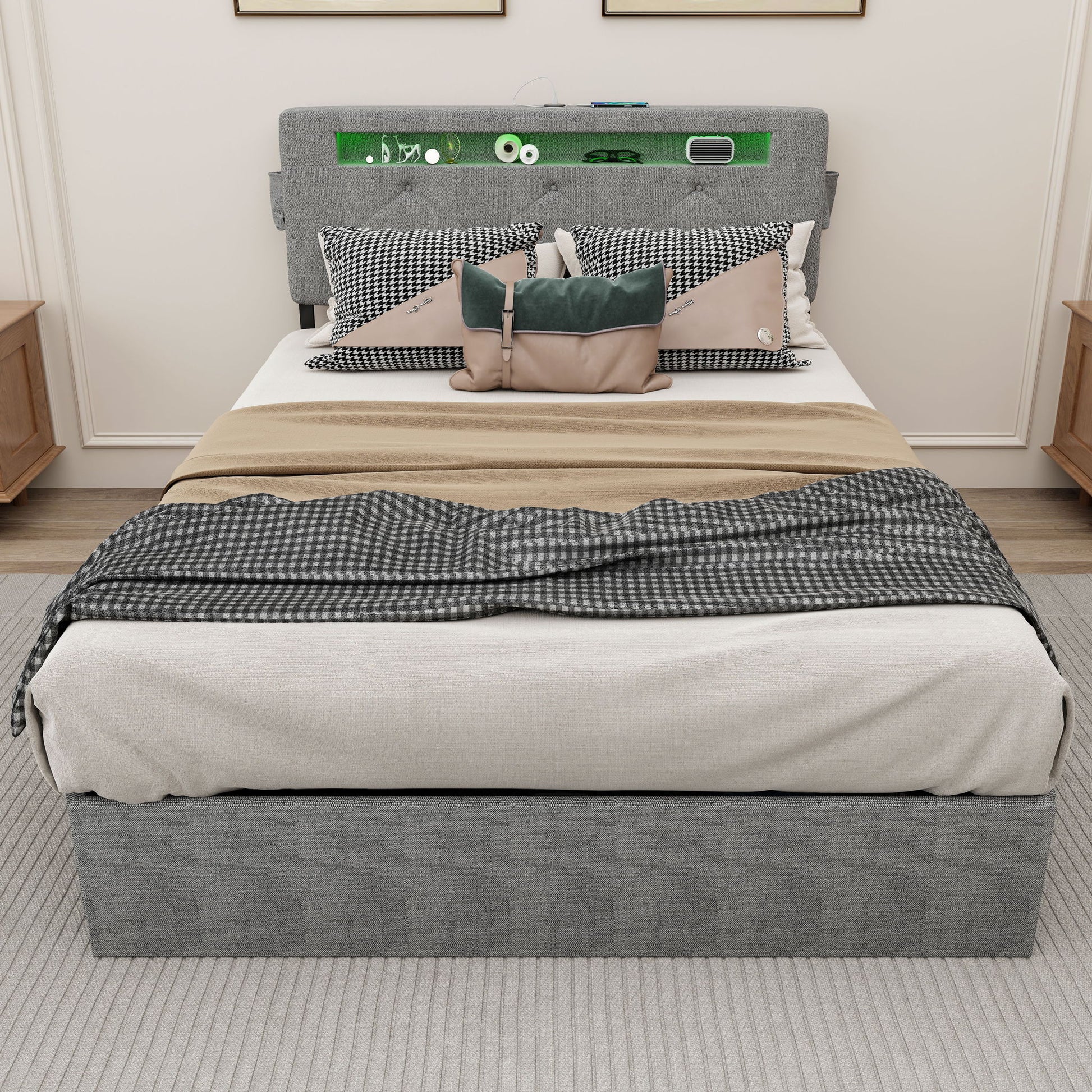 Queen Bed Frame With USB Charging & LED Lights With Storage Drawers - Light Gray
