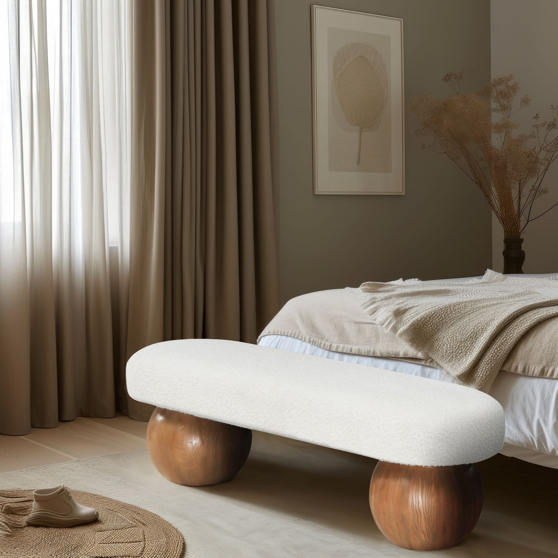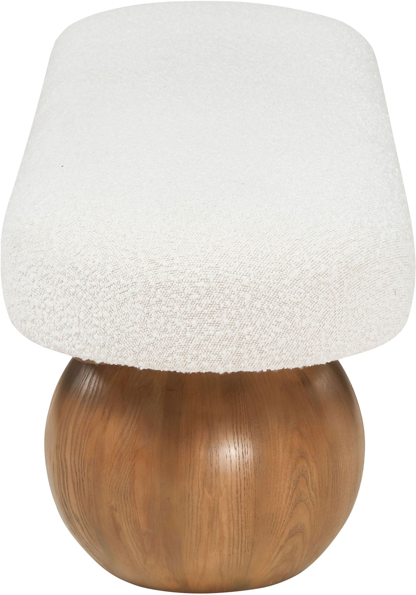 Elevate your home decor with this stunning Bowie Boucle Fabric Bench. The rich boucle fabric gives it a luxurious and sophisticated look that is sure to catch the eye of guests. The walnut finish on the solid ash wood ball-shaped legs adds a touch of charm and elegance to the piece. Whether you're using it as a stylish seating option in your living room or as a chic accent piece in your bedroom, this bench is sure to impress.