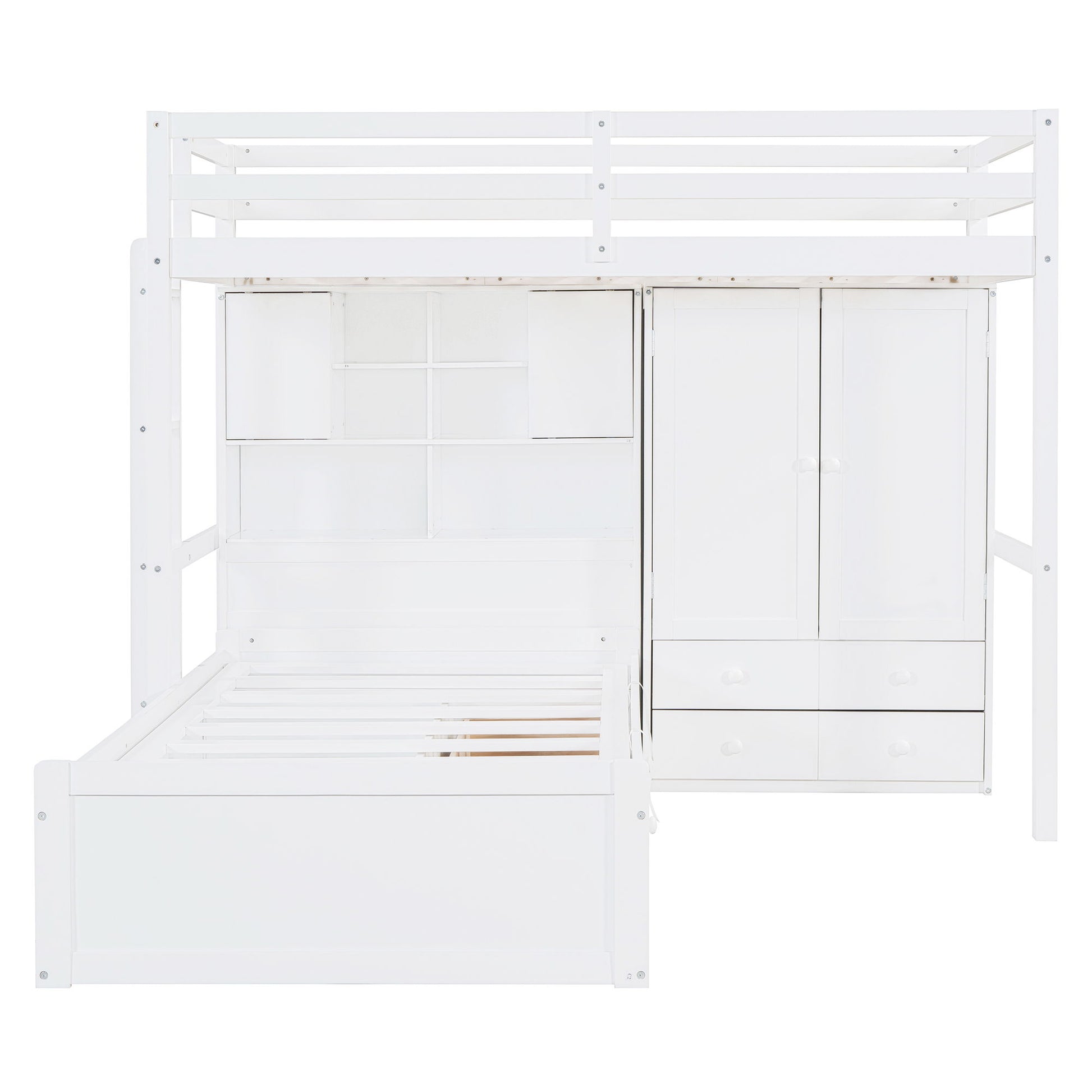 Twin Bunk Bed With Drawers, Wardrobe, Storage Shelves And Hydraulic Bed - White