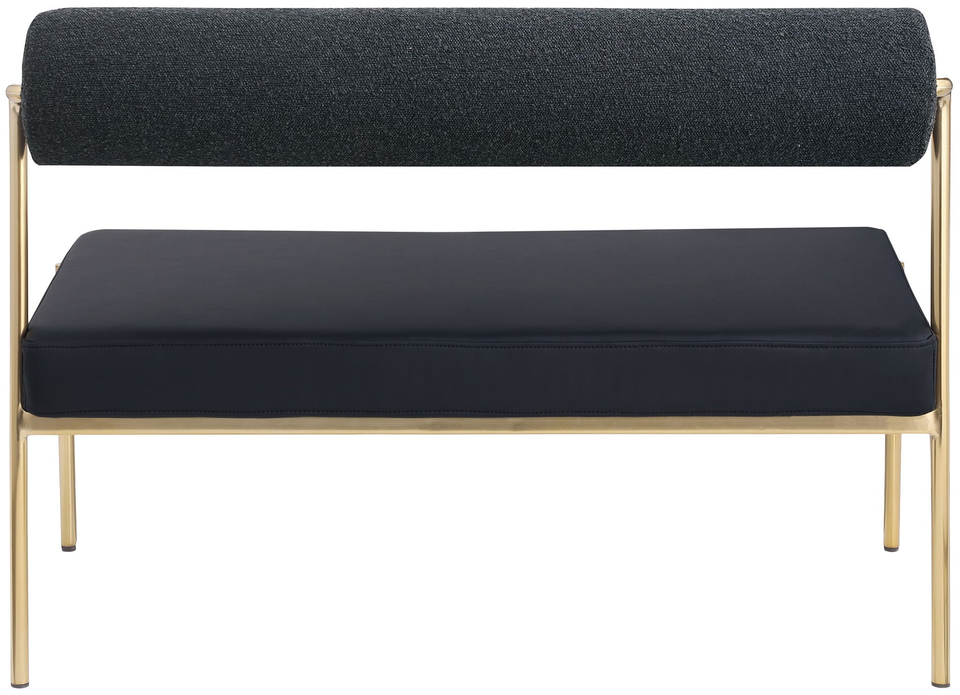Transform your dining area with this Carly vegan leather seat/boucle fabric back bench. Its vegan leather seat provides you with a soft place to sit, while its rich boucle back amps up the comfort level an extra notch. Its brushed brass iron frame ensures stability and durability, so you can enjoy this bench for years to come. This bench is perfect for any home featuring a contemporary design.