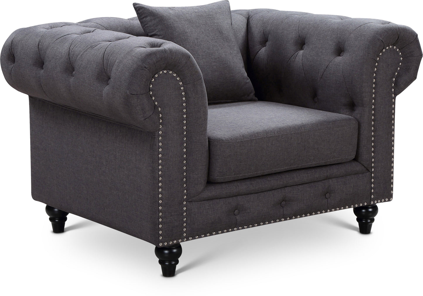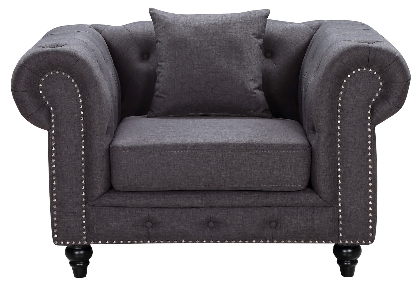 Elegant and eye-catching, the stunning Chesterfield Living Room from Meridian Furniture is the perfect addition to any space. covers the plush, comfortable seat, padded with high-density foam and modern tufted design. Strength and beauty is guaranteed with a solid wood frame and legs. Features a nail head design on the arms and includes matching throw pillows.