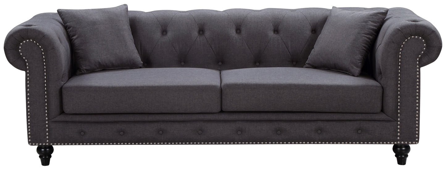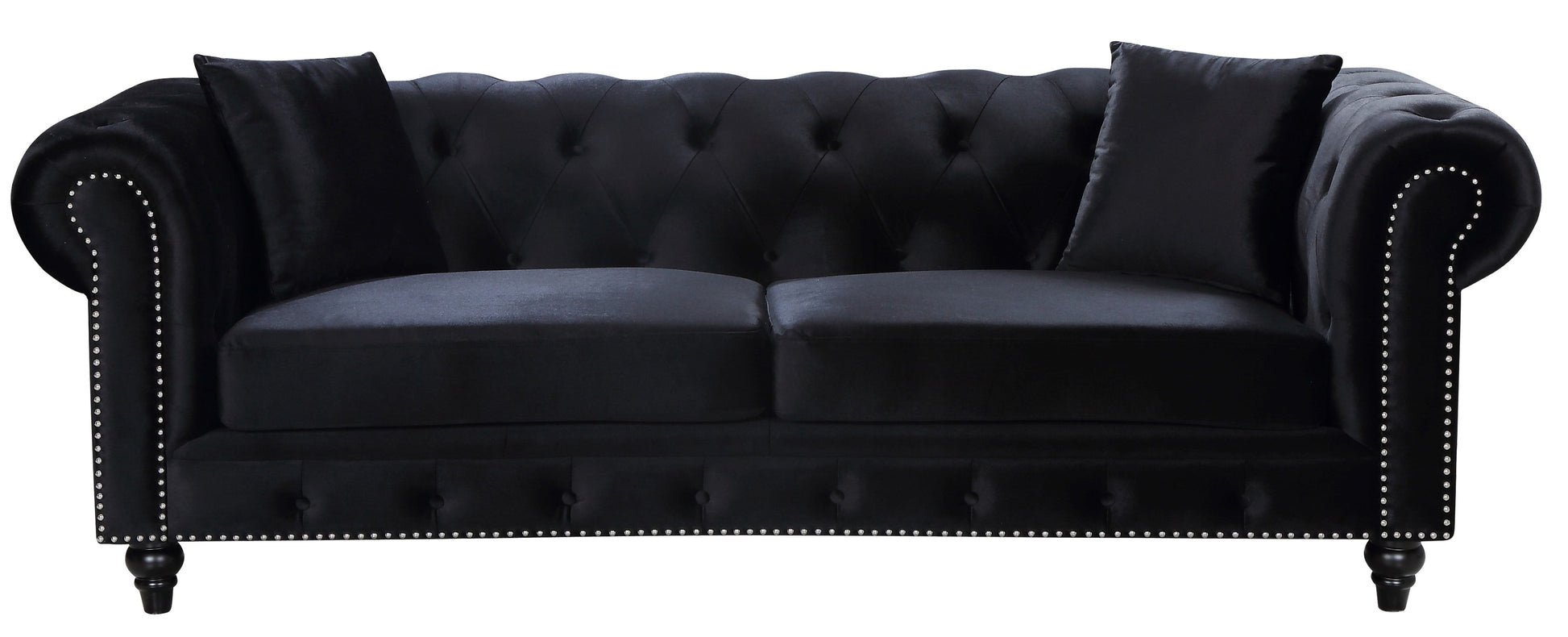 Elegant and eye-catching, the stunning Chesterfield Living Room from Meridian Furniture is the perfect addition to any space. covers the plush, comfortable seat, padded with high-density foam and modern tufted design. Strength and beauty is guaranteed with a solid wood frame and legs. Features a nail head design on the arms and includes matching throw pillows.