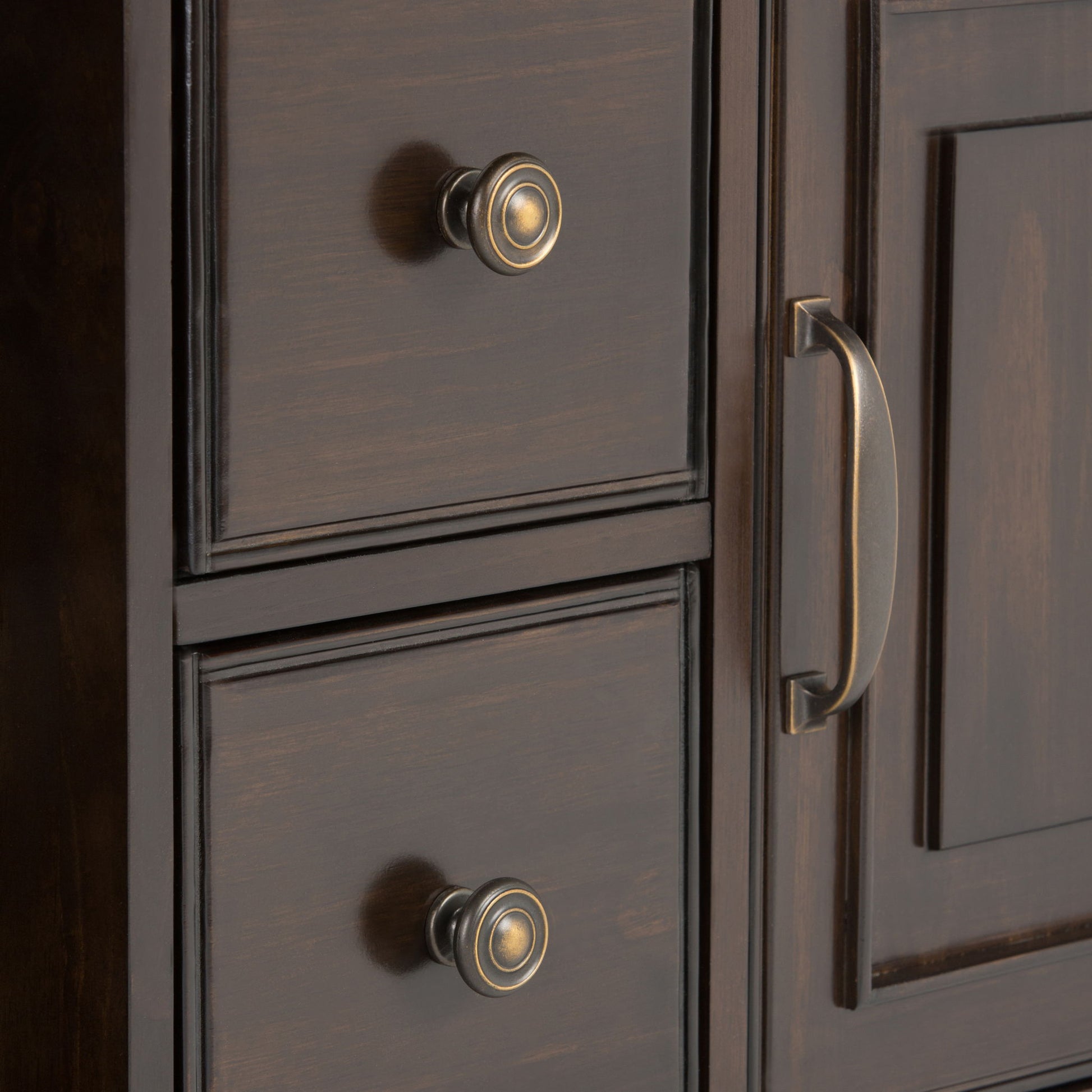 - Traditional style Includes vintage raised panel doors and drawers, notched legs, Bronze decorative hardware and metal drawer glides