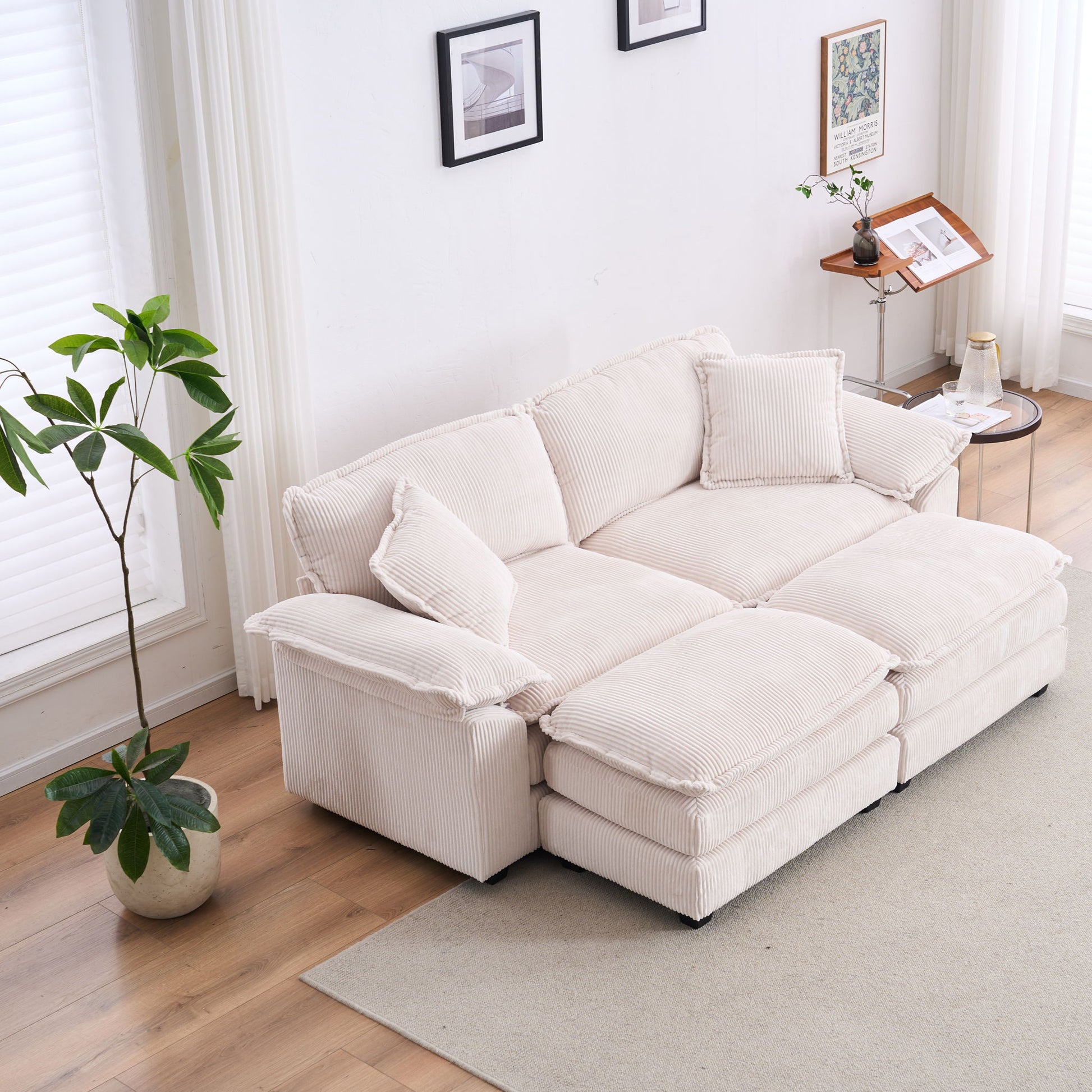 Corduroy 2 Seats Sofa With 2 Back Pillows, 2 Toss Pillows And 2 Ottoman, Comfy Sofa - Deep Seat Couch For Living Room - White