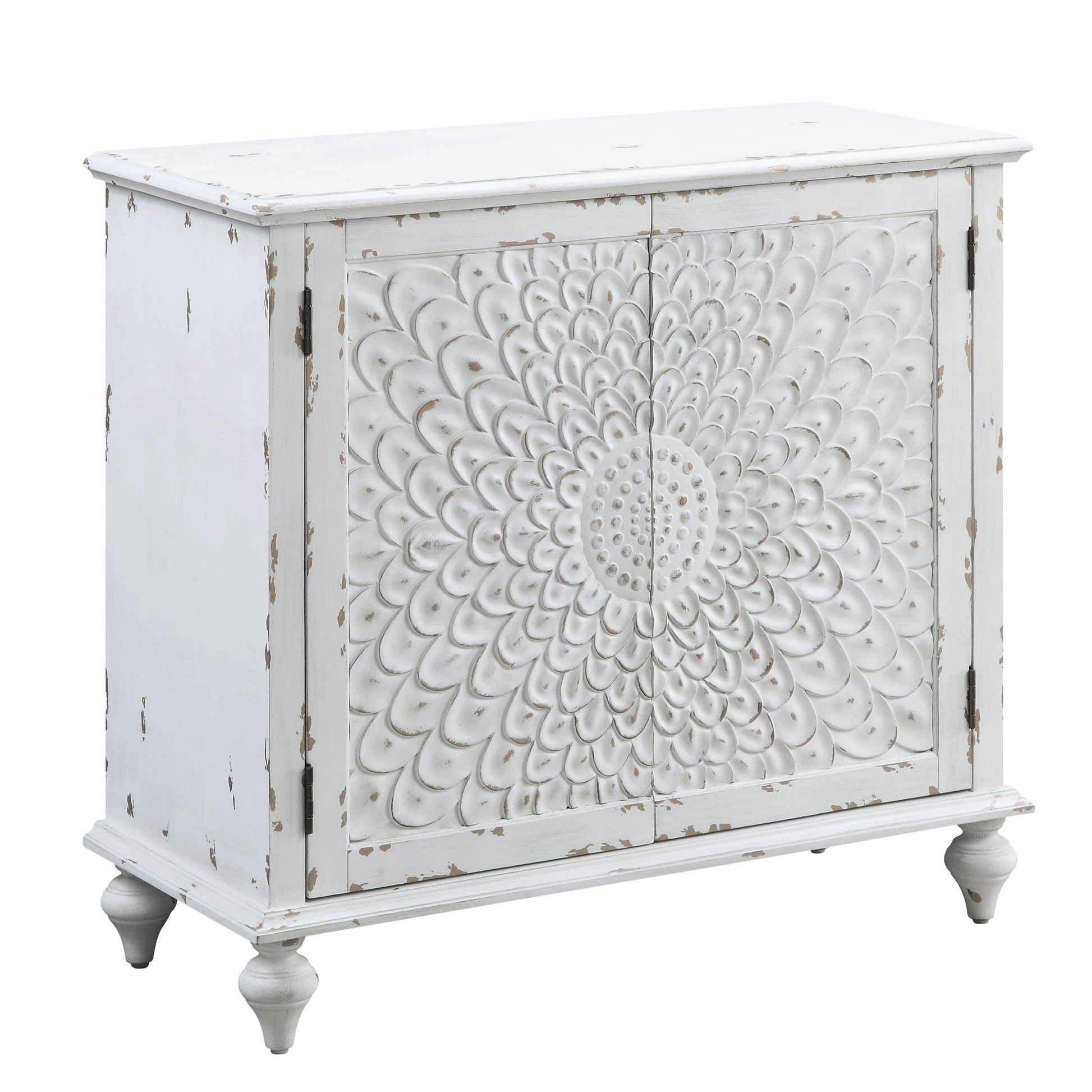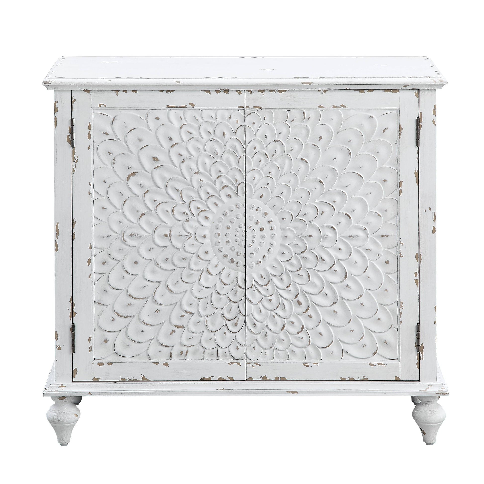- Intricate Detailing: The two-door cabinet showcases intricately patterned front doors, serving as a captivating focal point and enhancing the room’s aesthetic appeal.