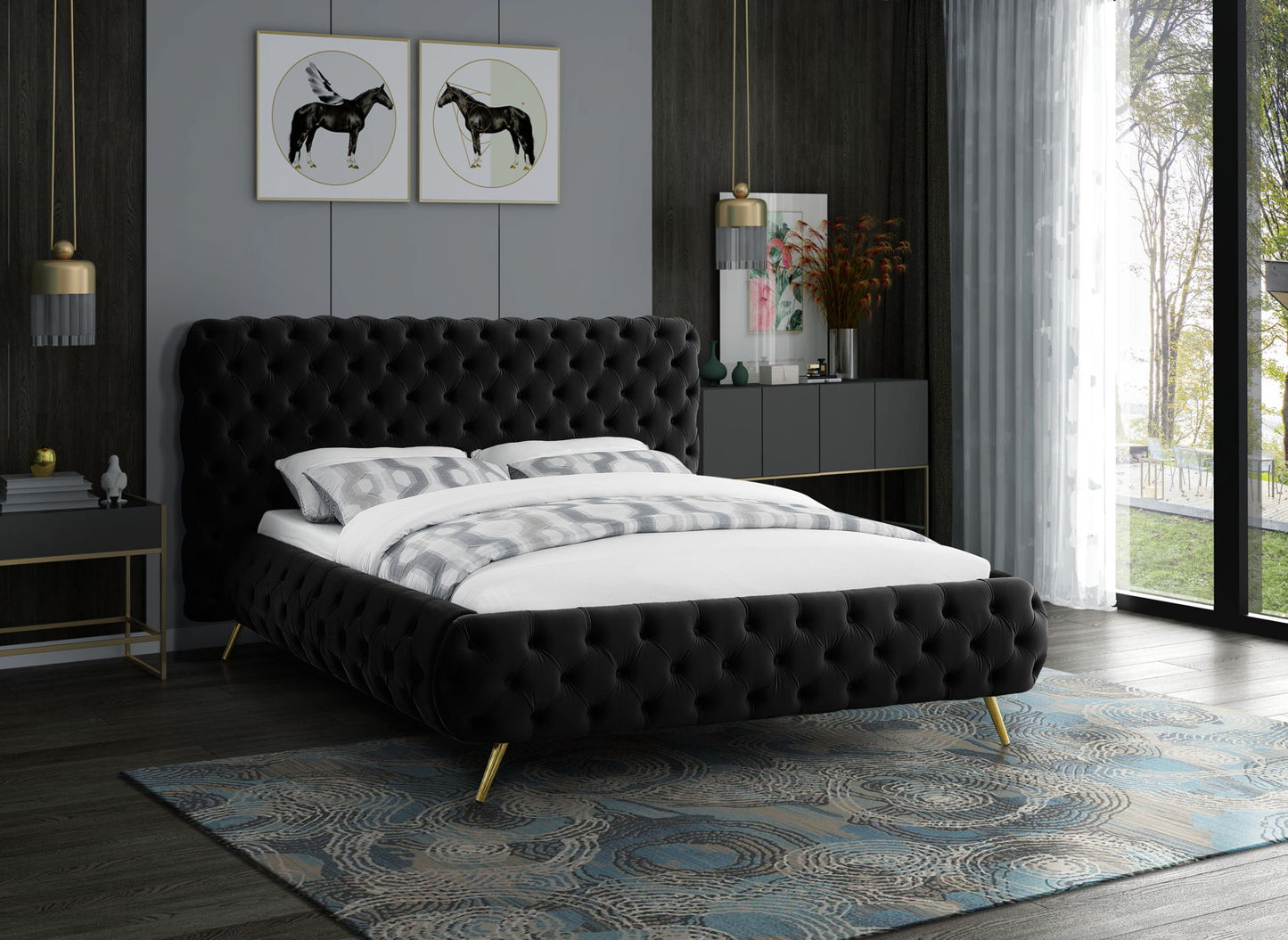 Surround yourself in modern luxury when you add this Delano Bed to your bedroom oasis. Sumptuous by design, this bed features all-over button tufting for a look that is nothing short of stunning. This dimensional bed features a heavily padded headboard and side rails, each covered in magnificent-to-the-touch velvet for a look that's upscale and simply divine. Metal legs on this bed allow easy clearance for vacuuming, and the bed uses just a mattress, so there's no need for a box spring or foundation, which only adds to its sleek look.