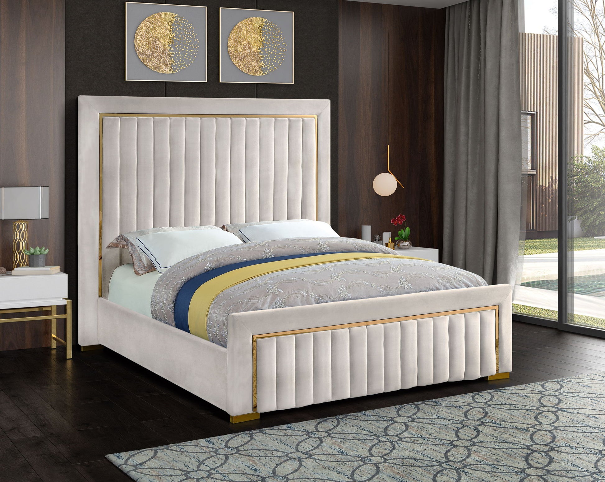 Ensconce yourself in regal modernity in this Dolce Bed. A super tall headboard makes this Dolce bed hard to ignore, ensuring it is the focal point in your bedroom sanctuary. The padded headboard is plump and welcoming, making it ideal for propping up against while you read the daily news or watch some TV. trim and channel tufting add to the headboard's luxurious look, lending it an air of regality and upscale refinement. The velvet upholstery is buttery-soft and lavish to the touch, making you feel like royalty with every nap.