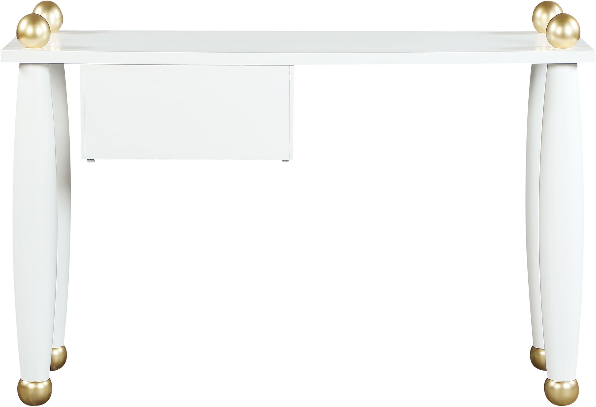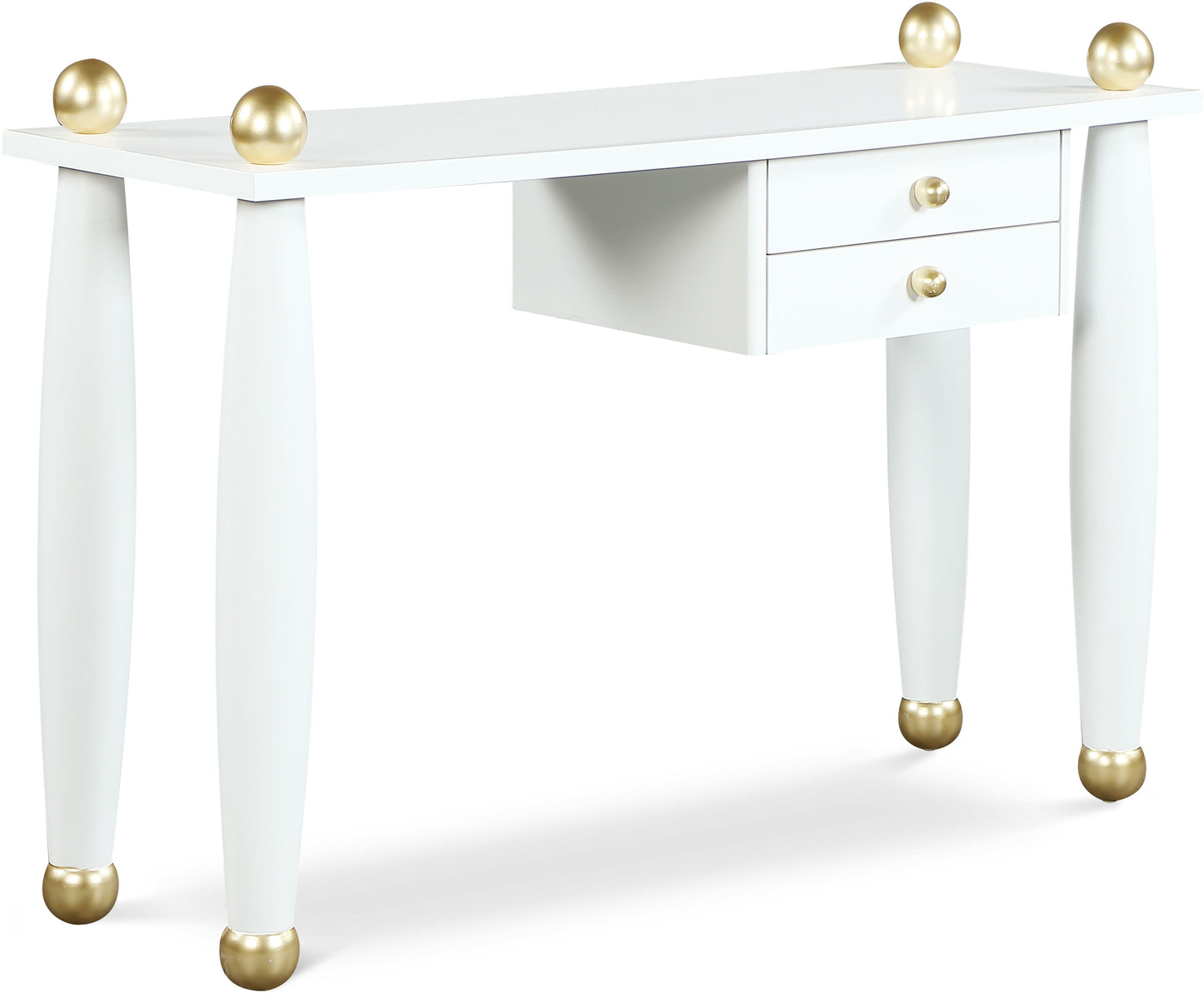 Bring versatile elegance to your room with this Etro gold console table/desk. Put it to work as a sophisticated addition to a foyer or entryway where it serves as a beautiful console table, or add it to your home office or other area as a functional desk complete with supply drawers. The rich white medium gloss finish gives it a contemporary vibe while the gold accents add to its affluent, regal appeal.