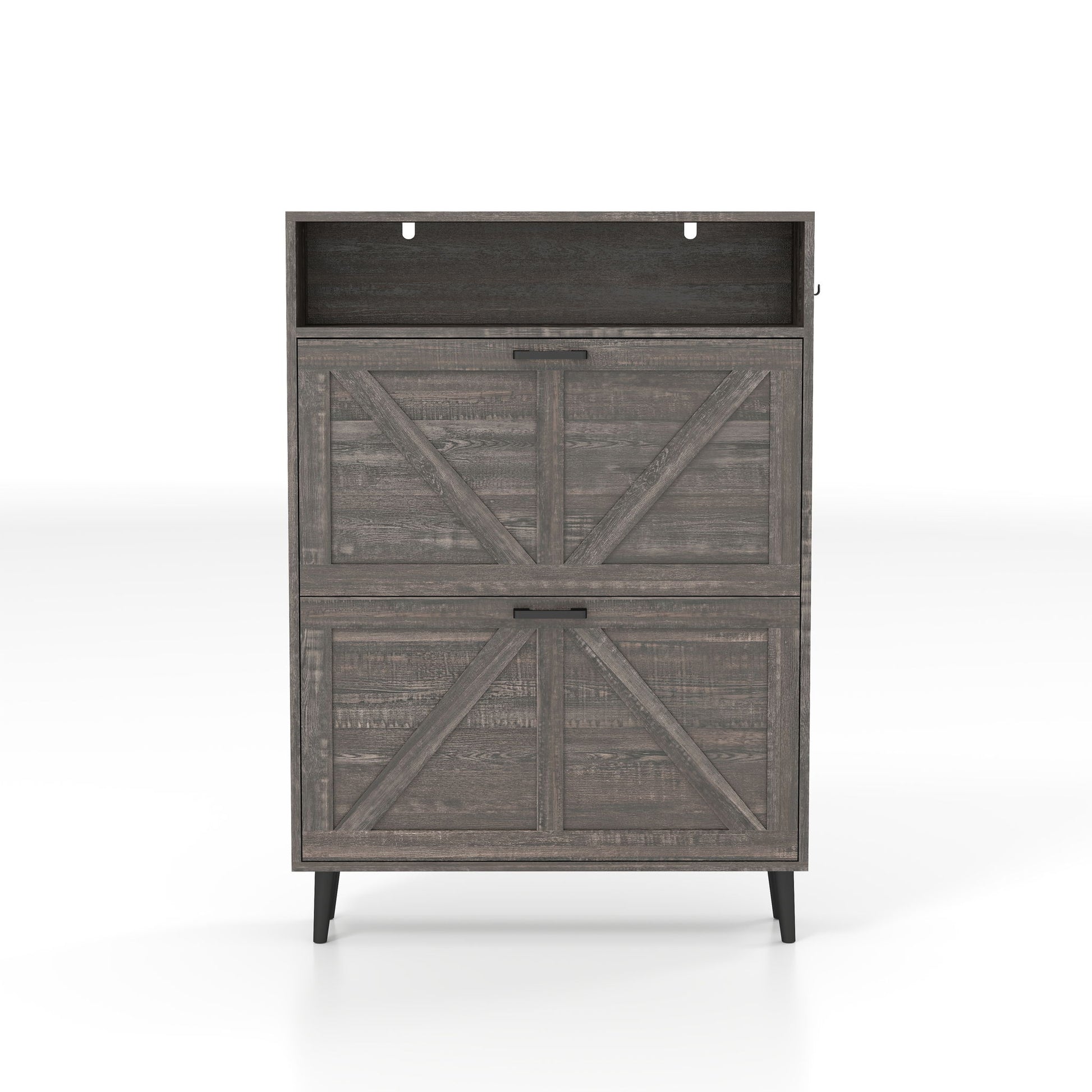 Farmhouse Shoe Storage Cabinet With Barn Door Design, 2 Flip Drawers, Hooks - Dark Oak