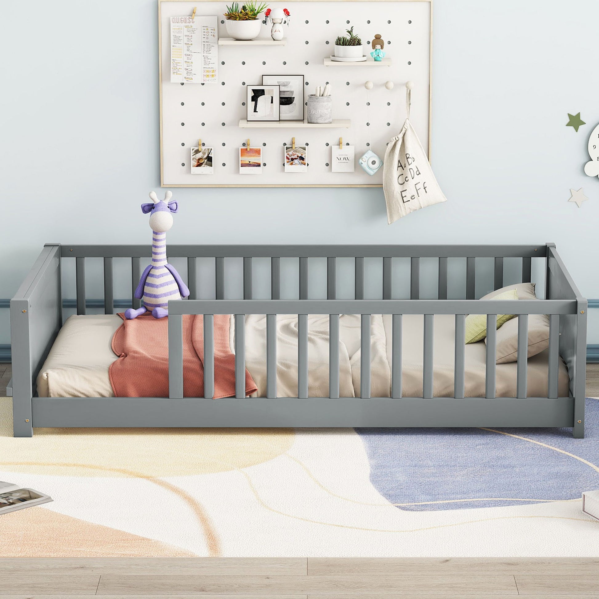Twin Size Floor Platform Bed With Built-In Book Storage Rack - Gray
