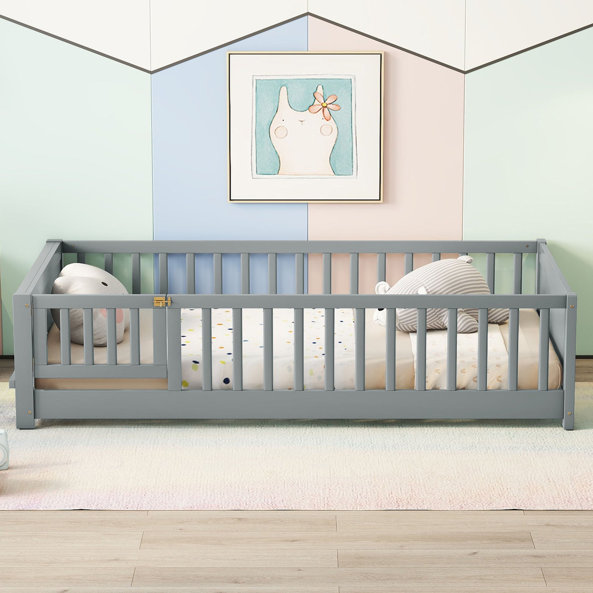Twin Size Floor Platform Bed With Built-In Book Storage Rack, Door - Gray
