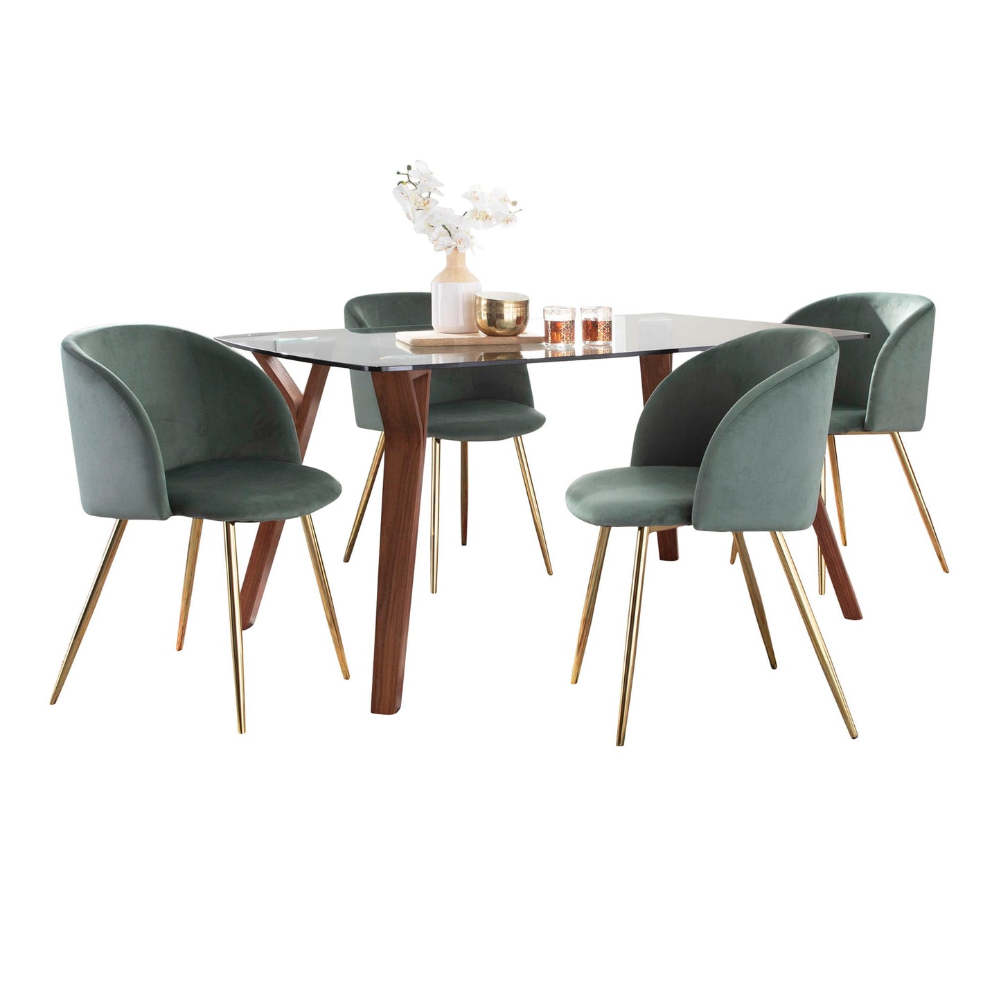 Folia Fran - 5 Piece Mid-Century Modern Dining Set - Walnut / Clear / Gold / Sage Green