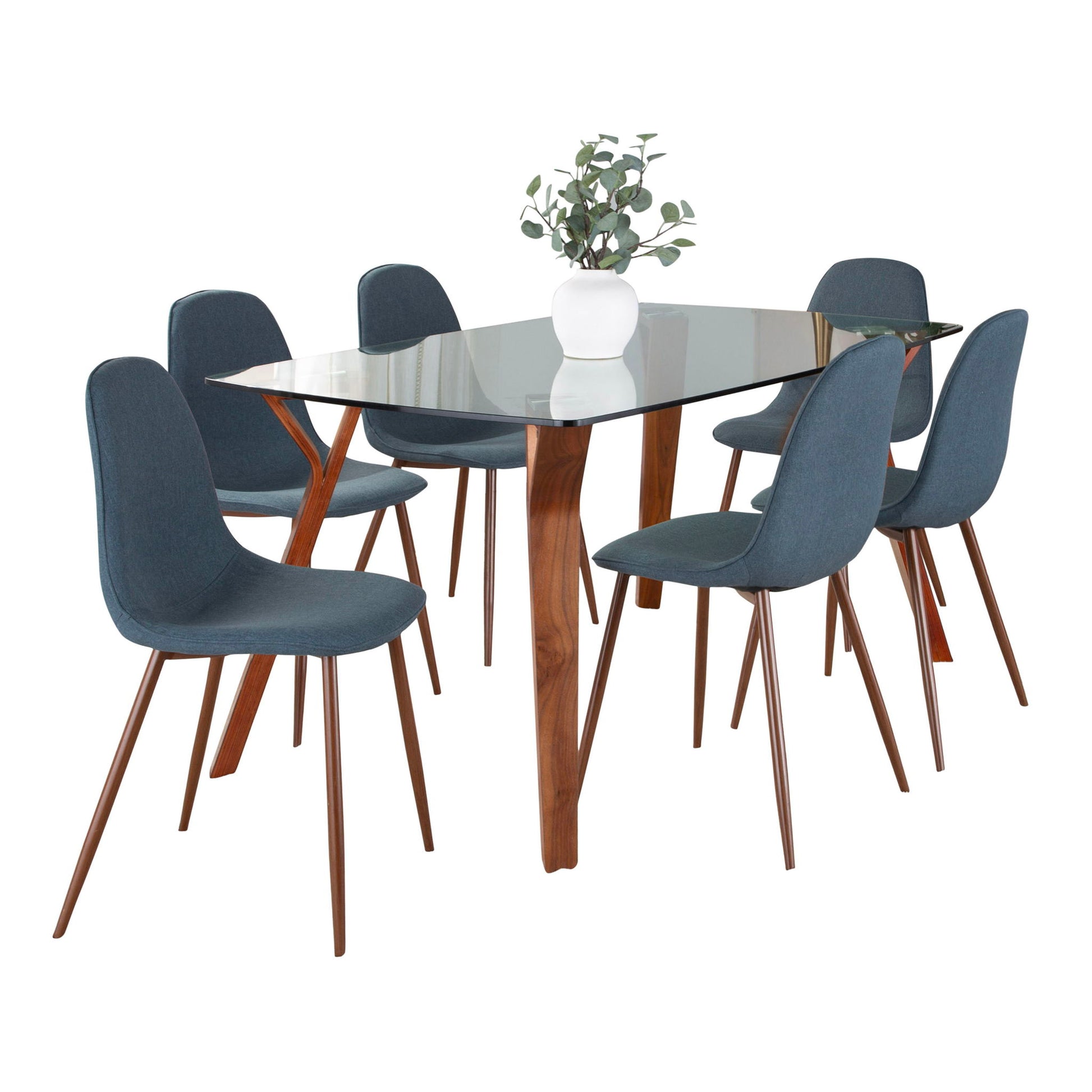 Folia Pebble - 7 Piece Mid-Century Modern Dining Set - Clear Tempered / Walnut / Blue