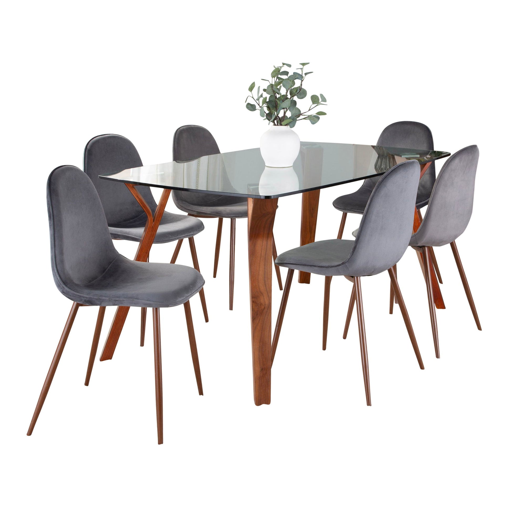 Folia Pebble - 7 Piece Mid-Century Modern Dining Set - Walnut / Clear Tempered / Walnut / Gray