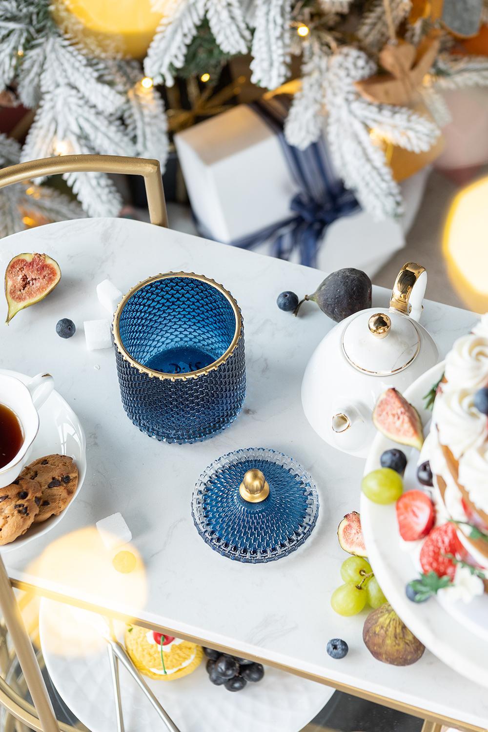- Vintage Inspiration: The jars draw inspiration from vintage glassware, featuring a cylindrical silhouette and a unique texture, combined with a stunning blend of deep blue and rich gold tones.