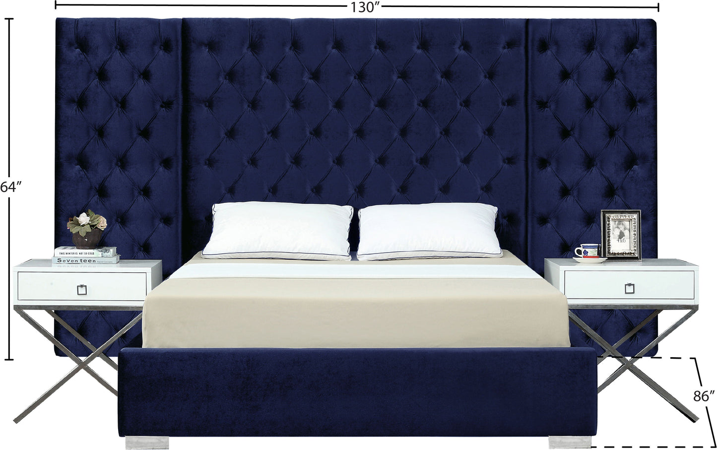 Rejuvenate your bedroom space with this Grande Bed. Svelte velvet covers each inch of this magnificently styled bed, lending it a bit of softness and glamour. The bold headboard is heavily button tufted for a regal and sophisticated look, and it's padded, so you can rest your back against it while you read or watch TV. The full-framed base is modish and sleek and provides sturdy support for the mattress of your choice.