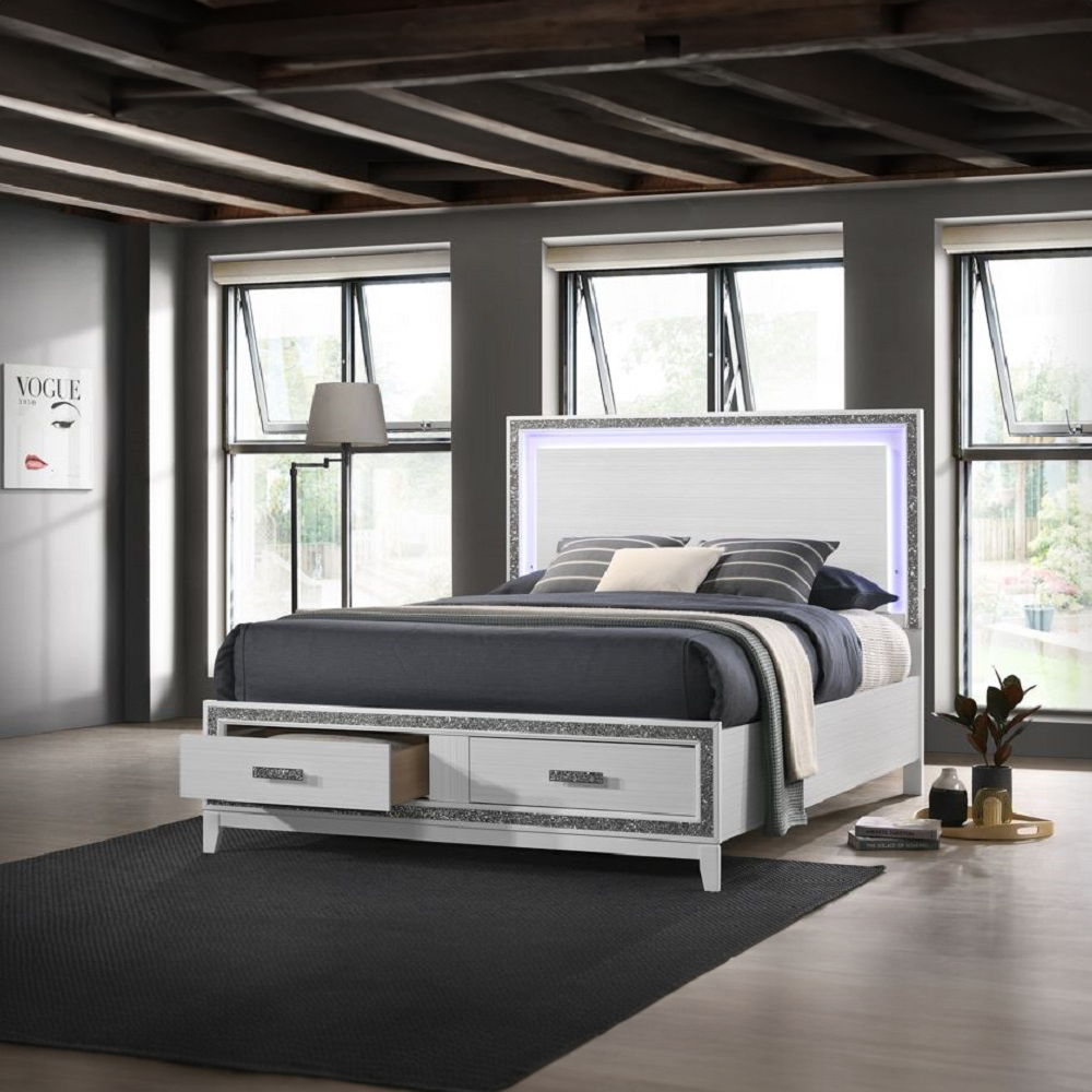 Box Spring Required Panel Headboard w/LED Shimmering Silver Trim Accent Storage Footboard