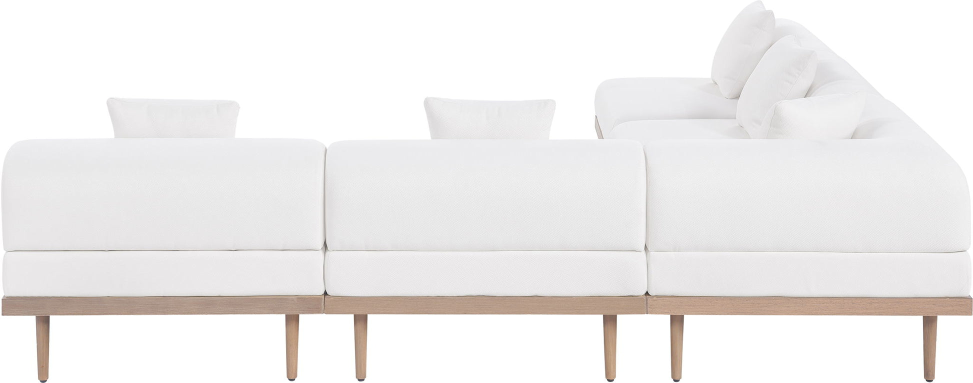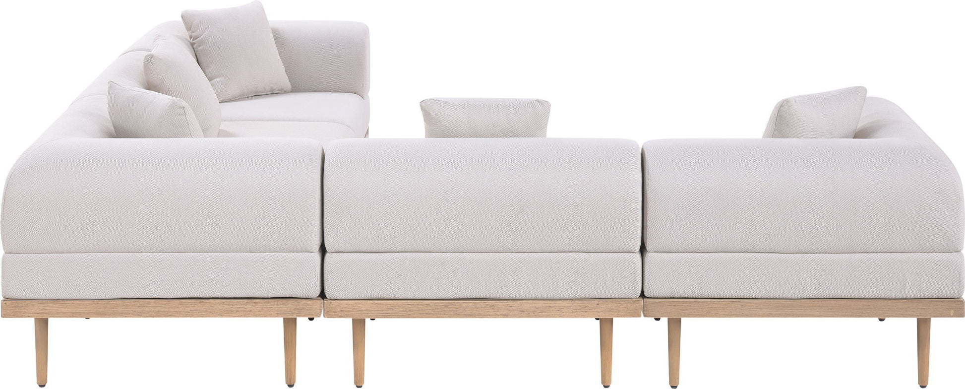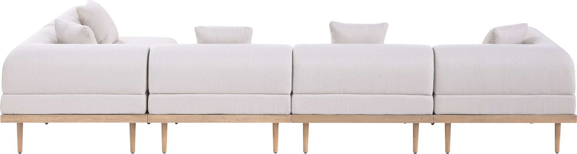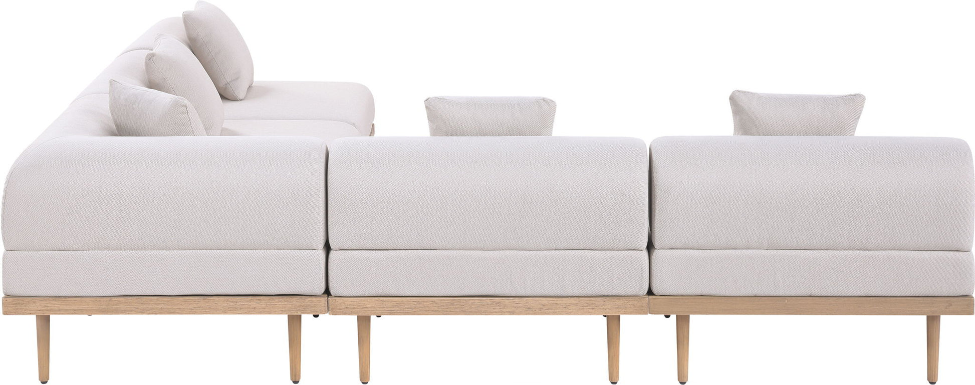 Sleek lines and soft water-resistant fabric bring contemporary style to the Laguna outdoor patio modular sectional. Crafted with a natural teak finish aluminum frame and quick-dry foam, it's built for ultimate outdoor relaxation. Rearrange or add to the set for endless configurations, creating a versatile lounging experience tailored to your space.