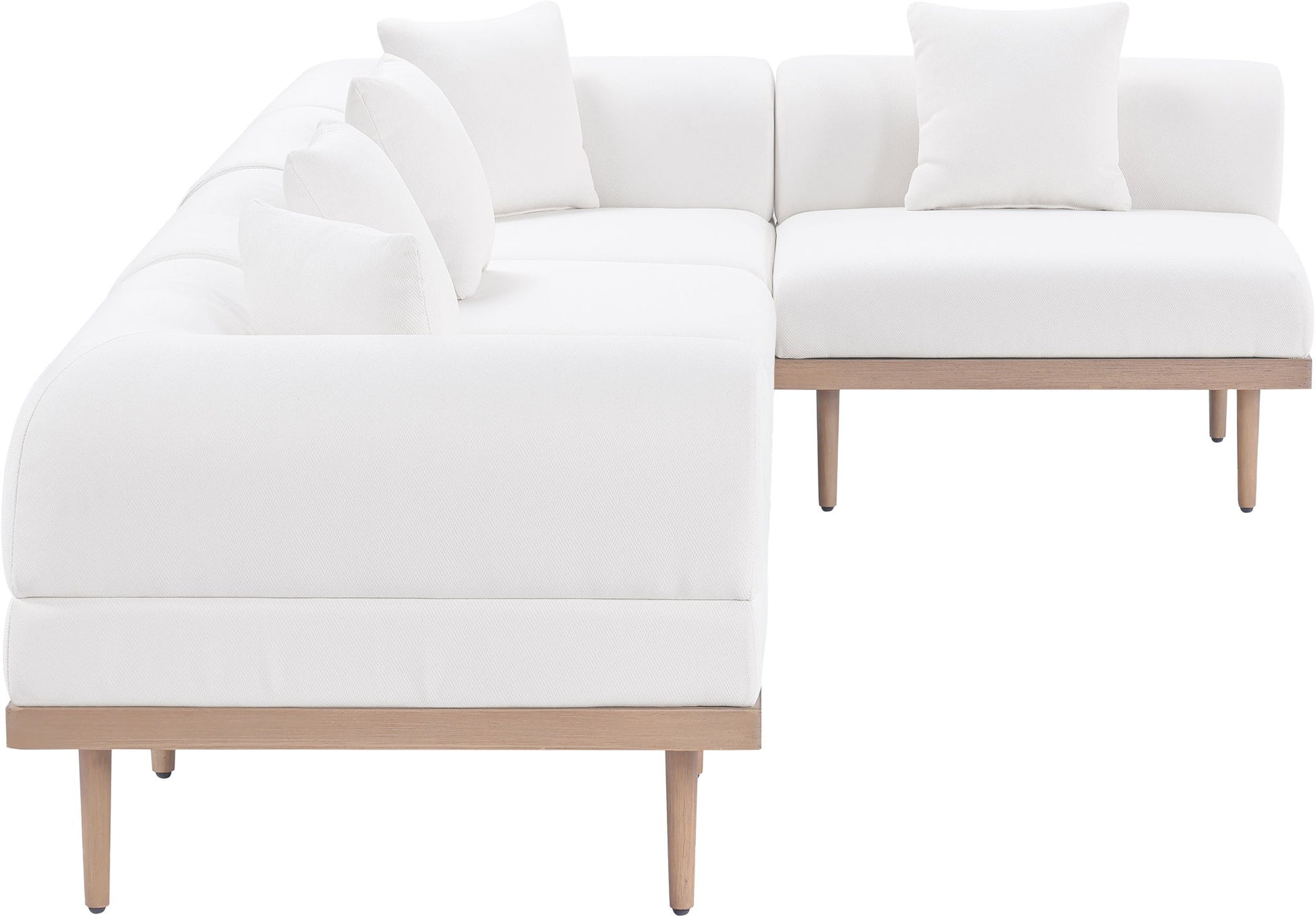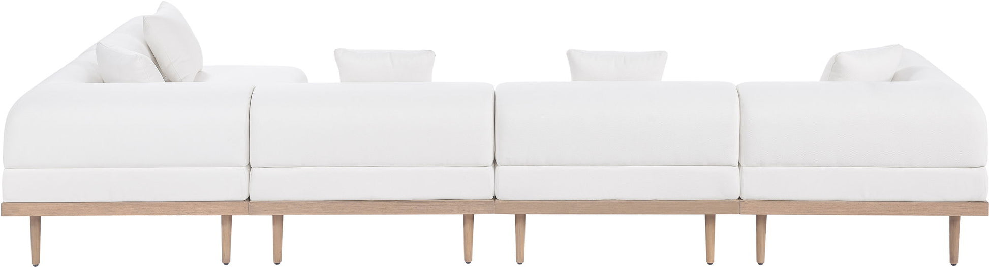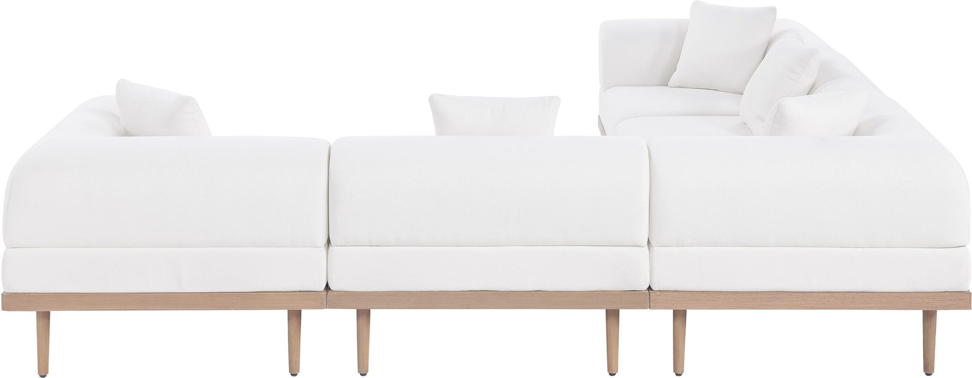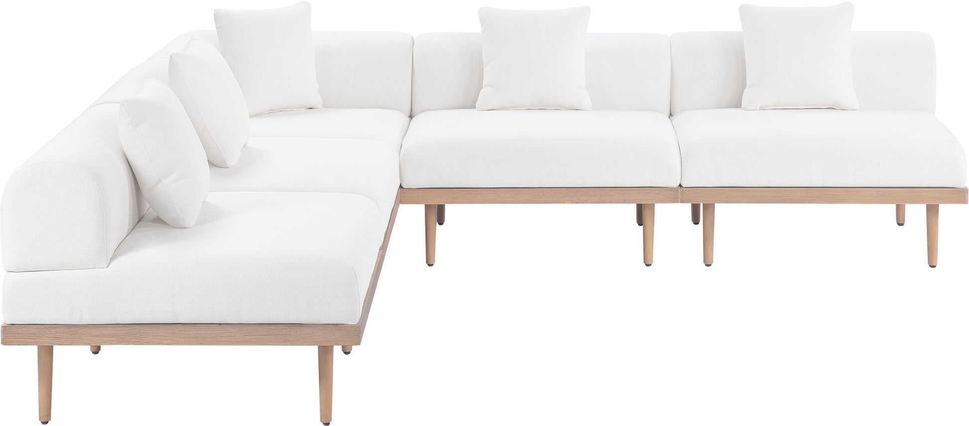 Sleek lines and soft water-resistant fabric bring contemporary style to the Laguna outdoor patio modular sectional. Crafted with a natural teak finish aluminum frame and quick-dry foam, it's built for ultimate outdoor relaxation. Rearrange or add to the set for endless configurations, creating a versatile lounging experience tailored to your space.