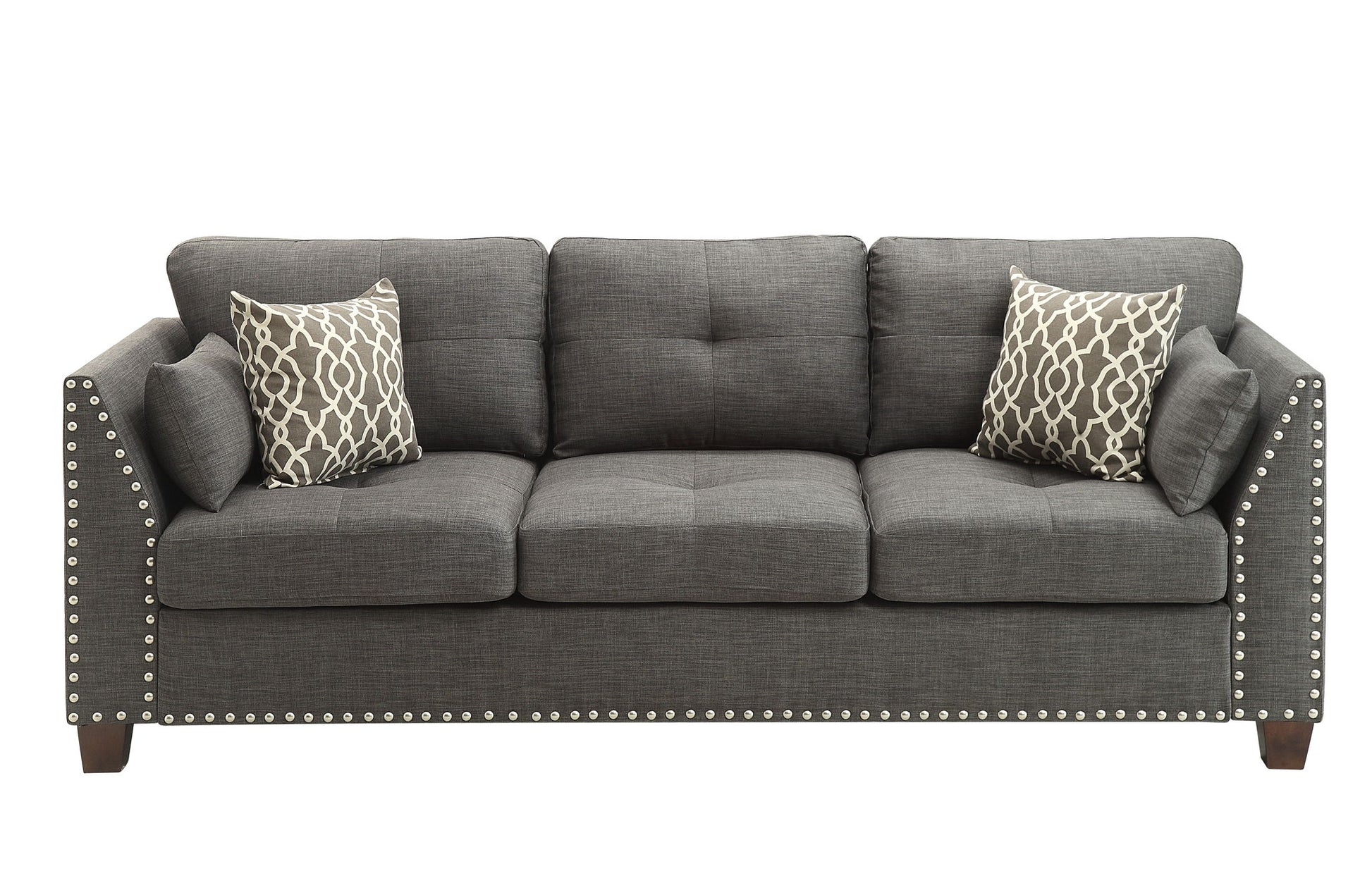 - Elegant Design: This light charcoal linen sofa showcases a sophisticated look with buttonless tufted back and seat cushions, adding to its luxurious appeal. The sleek, flared armrests adorned with nailhead trim provide refined detail, enhancing the sofa's elegance.