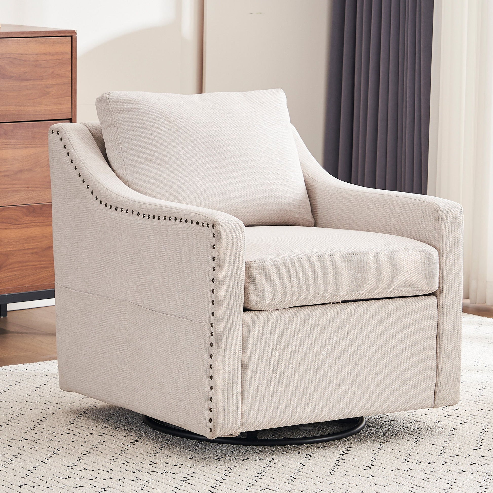 Linen Fabric 360° Swivel Accent Chair With Upholstered Back Pillow And Rivet Armrest - Beige