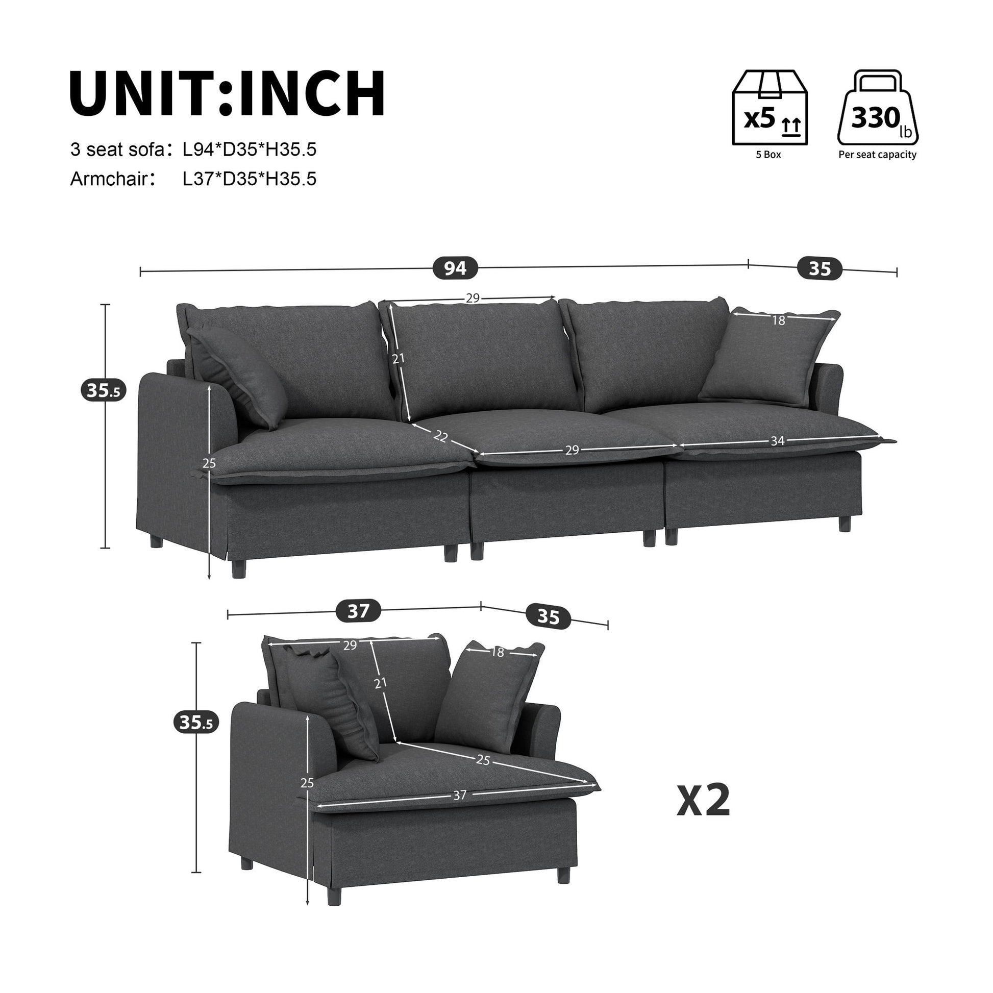 2 Piece Living Room Set With Throw Pillows Sectional Couch Sets, Upholstered 3 Seater Sofa & Armchair 4 Seat - Gray