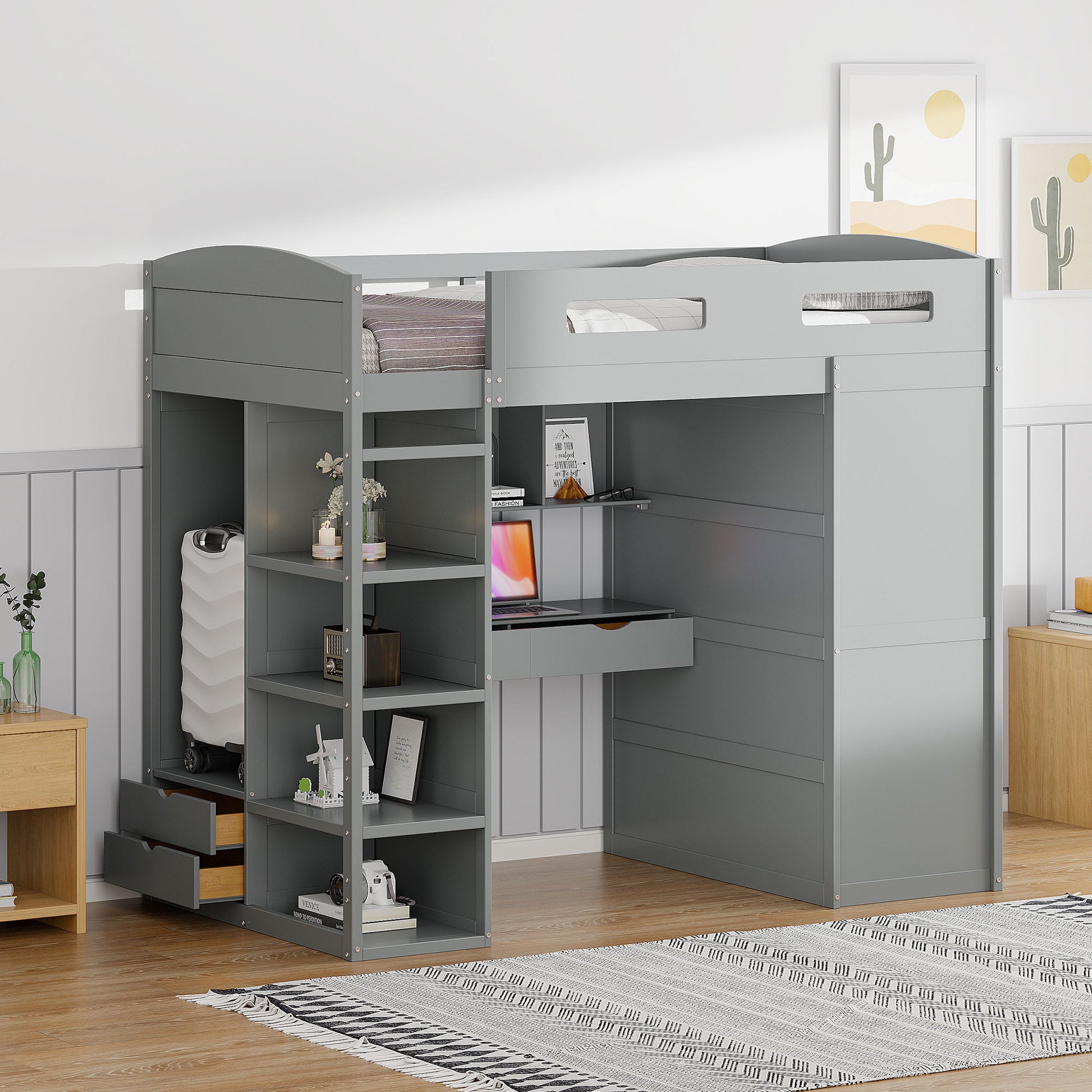 Twin Size Loft Bed With Desk, Wardrobes, 4 Drawers And 4 Shelves Construction - Gray