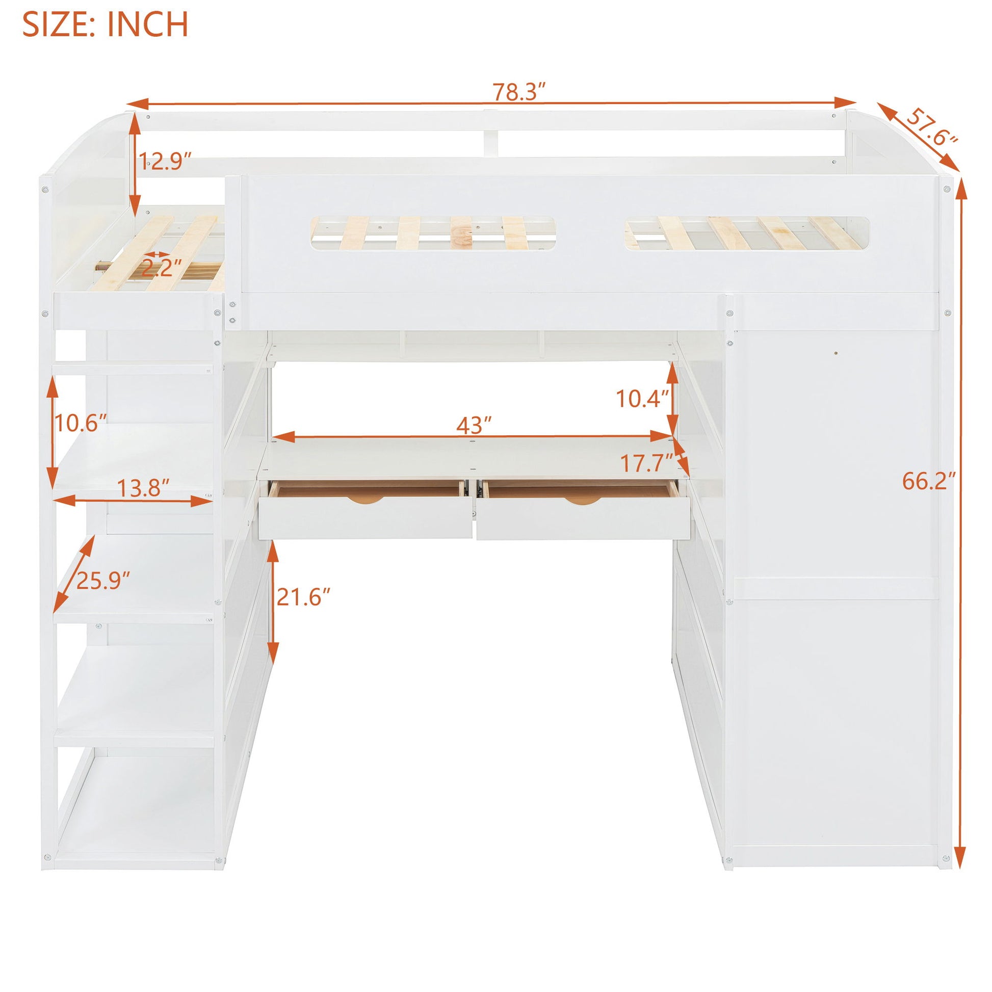 Full Size Loft Bed With Desk, Wardrobes, 4 Drawers And 4 Shelves - White