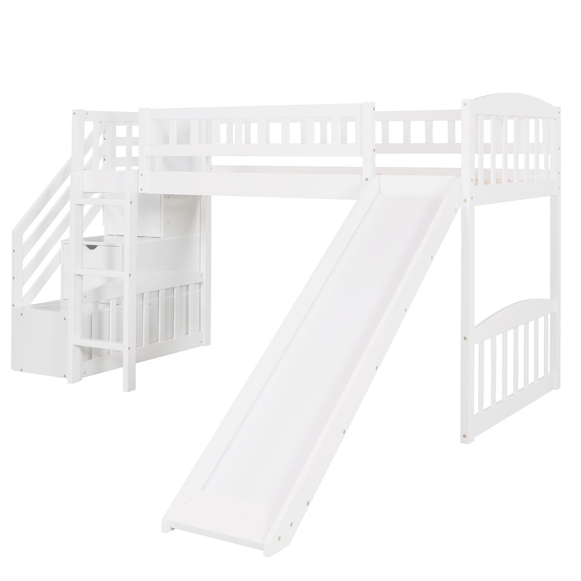 Twin Size Loft Bed Stairway With 2 Drawers And Slide - White