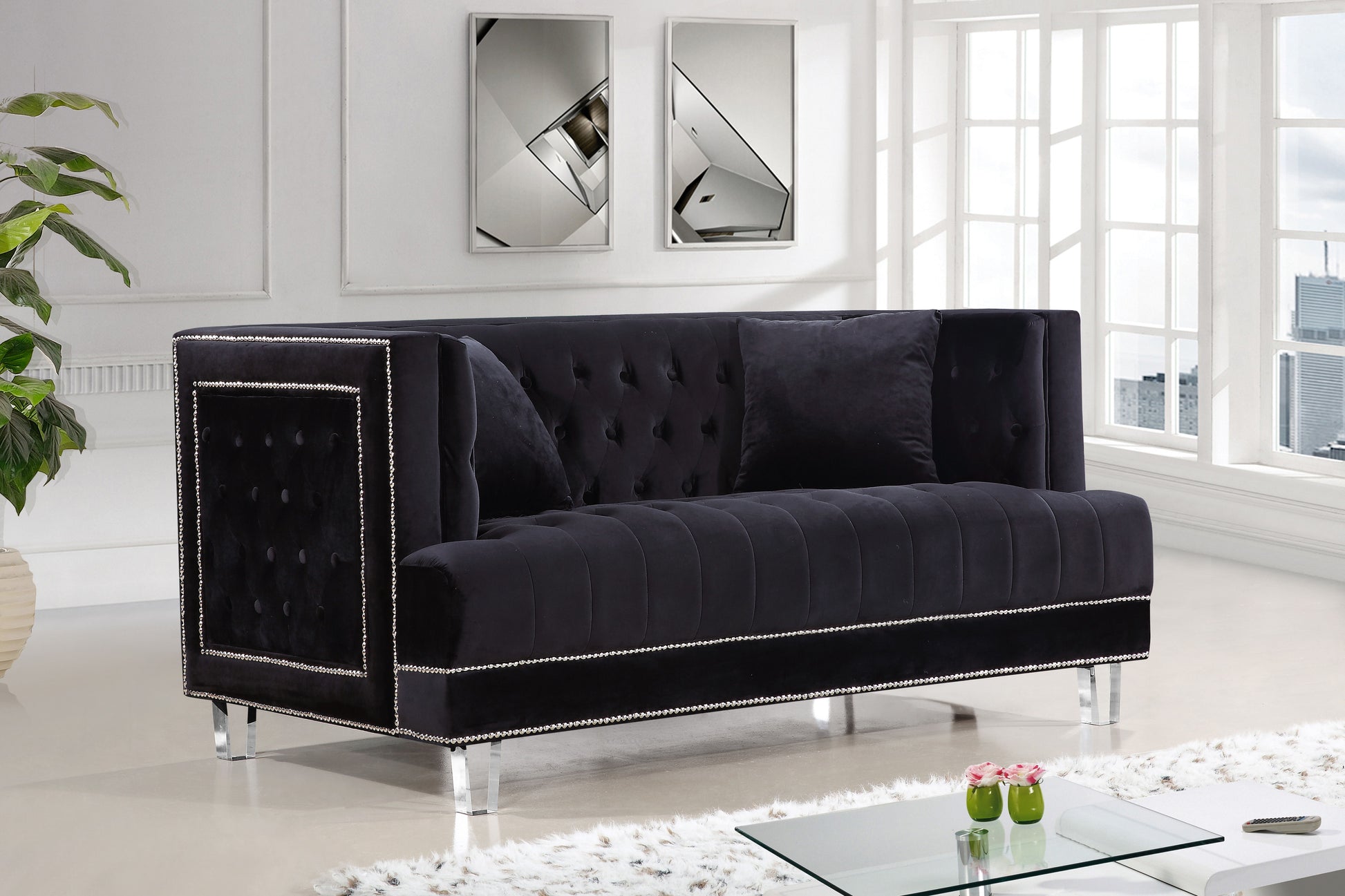 The Lucas Collection by Meridian Furniture. Features beautifully tufted velvet upholstery with a custom nail head design and clear acrylic legs. This collection is guaranteed to be the highlight of any home.