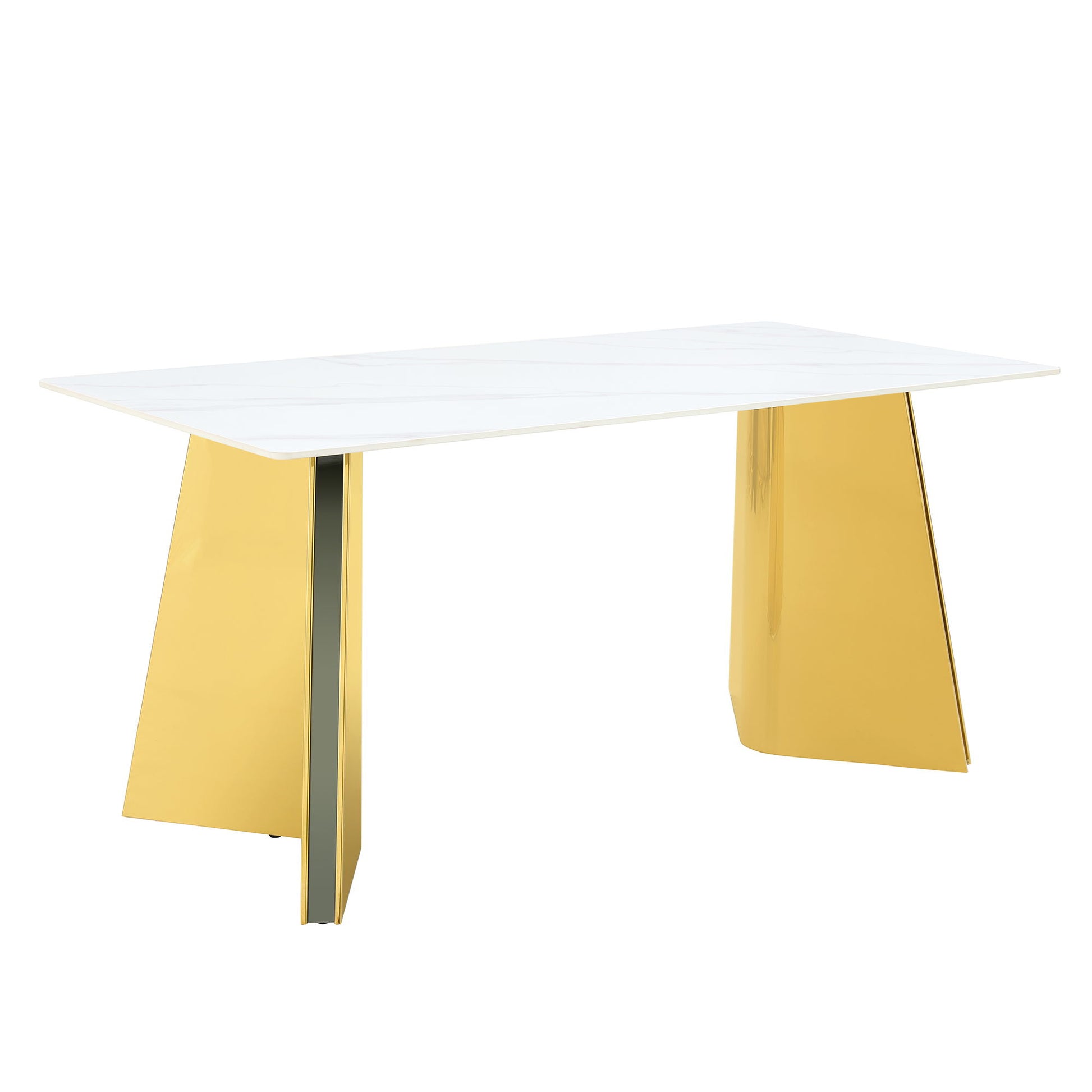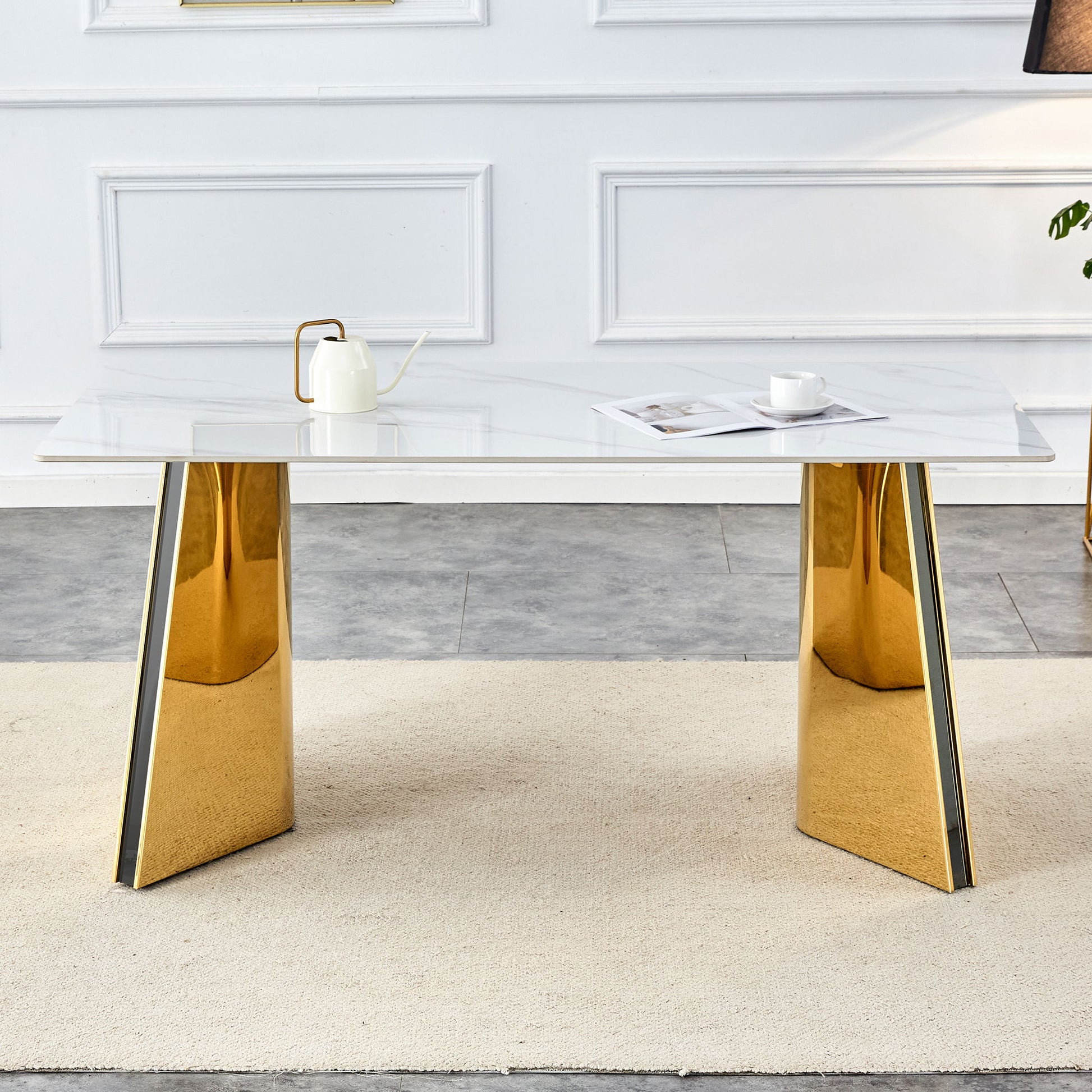 Luxurious Snow Mountain Texture Sintered Stone Dining Table With Stainless Steel Butterfly Legs, Scratch & Heat Resistant - Gold / White