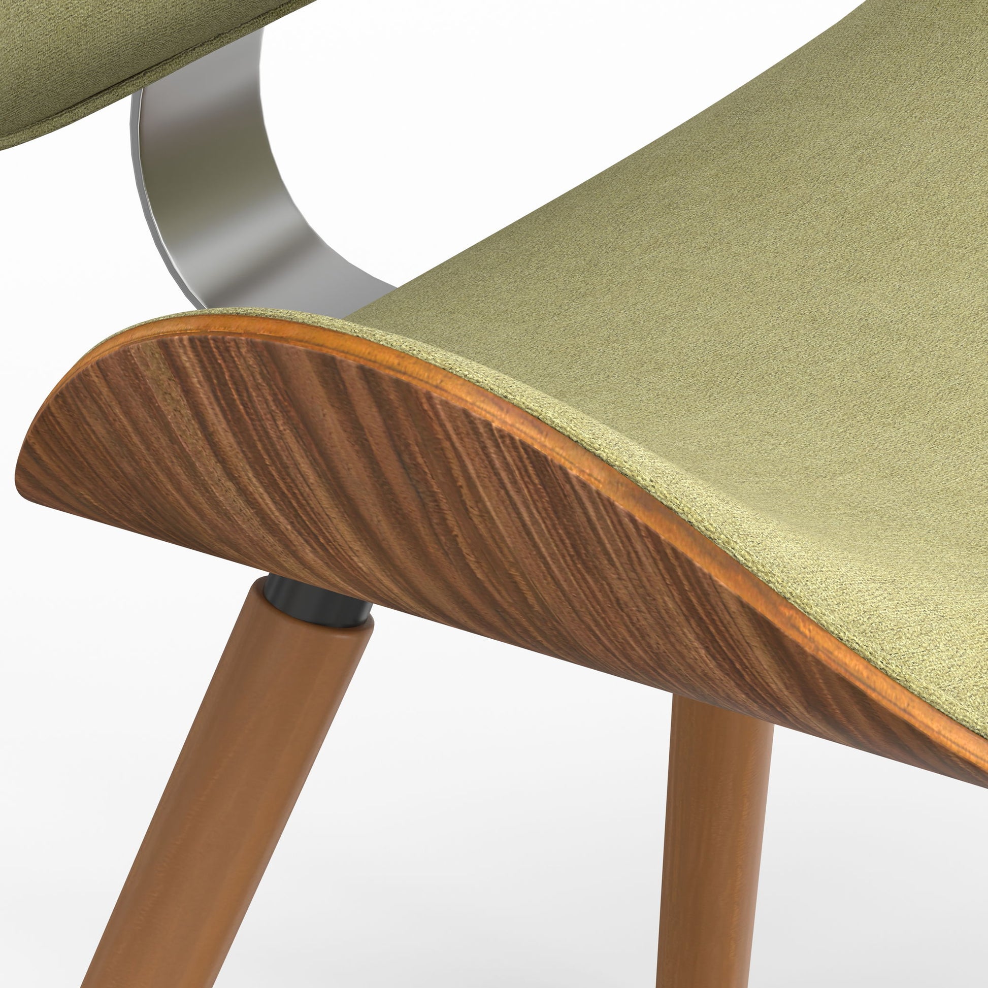 - Mid Century Modern design features comfortable curved padded seat and seat back, walnut veneer on bentwood frame, metal back support bar